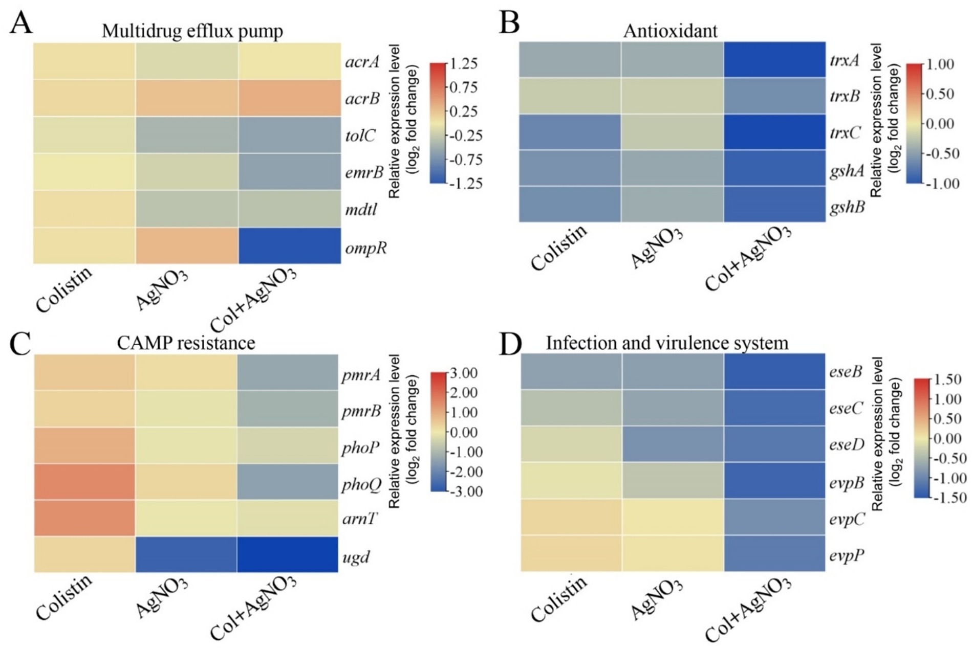 Figure 6. Transcriptional changes of E. piscicida treated by AgNO3 and colistin. Selected pathways involved (A) multidrug efflux pump, (B) antioxidant, (C) CAMP resistance, and (D) bacterial infection and virulence system.