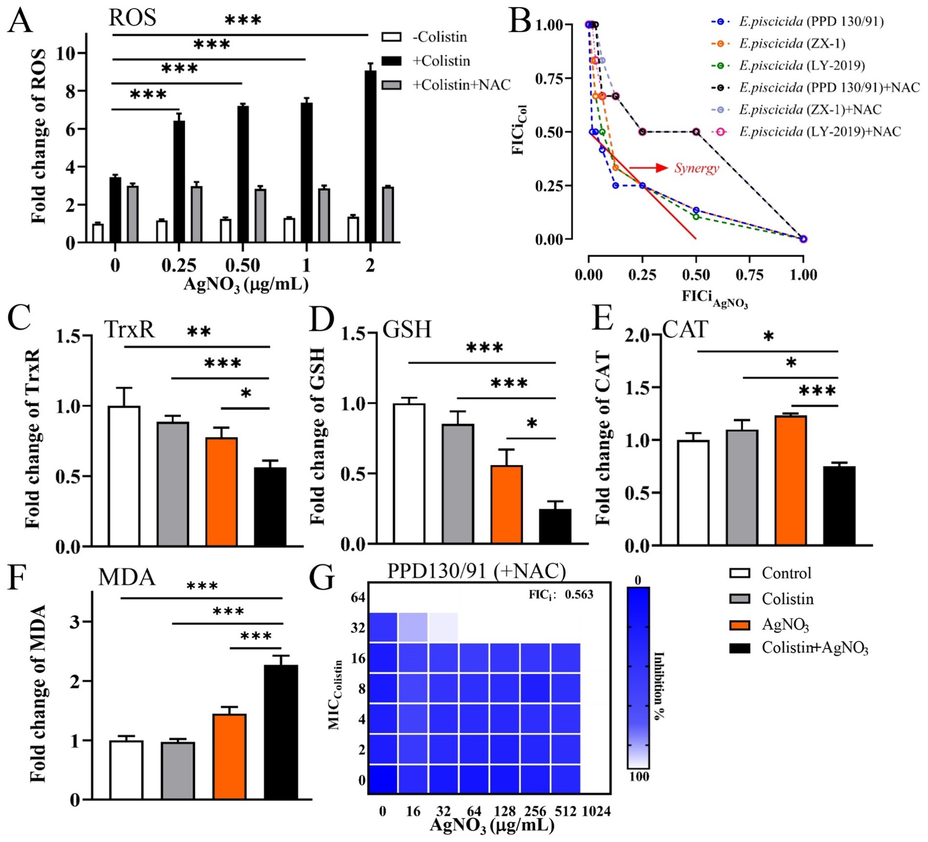 Figure 7. Oxidative stress contributes to the killing efficacy of AgNO3 and colistin against E. piscicida. (A) Relative contents of ROS in E. piscicida, respectively, treated by colistin, AgNO3, colistin + AgNO3, or colistin + AgNO3 + NAC. (B) Isobolograms of E. piscicida isolates treated by colistin + AgNO3 + NAC. (C) TrxR activity in treated E. piscicida. (D) Content of GSH in treated E. piscicida. (E) CAT activity in treated E. piscicida. (F) Content of MDA in treated E. piscicida. (G) Isobolograms of E. piscicida PPD130/91 treated by colistin + AgNO3 + NAC. The values are expressed as mean ± SD (n = 4), and statistical differences were tested by one- or two-way ANOVA analysis. (*p < 0.05, **p < 0.01, and ***p < 0.001).