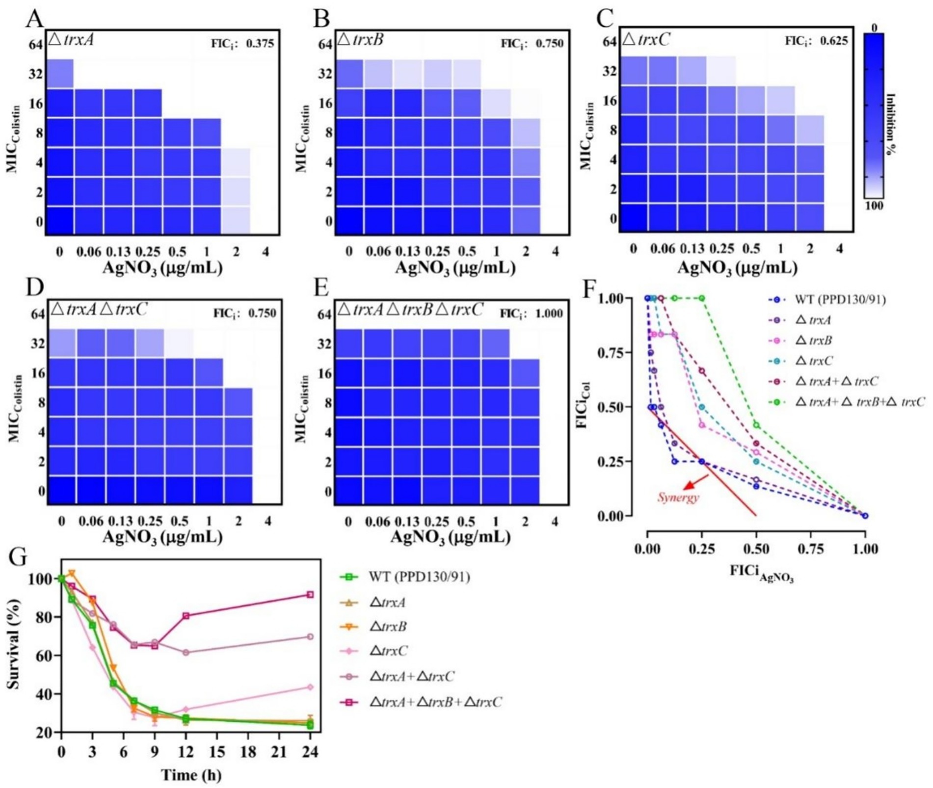 Figure 8. Inactivation of trx genes mitigates the synergistic effect of AgNO3 and colistin on E. piscicida. (A–E) Checkerboard assays between AgNO3 and colistin in E. piscicida trx mutants. (F) Isobolograms of E. piscicida trx mutants treated by colistin + AgNO3. (G) Survival ratio of E. piscicida trx mutants after exposure to colistin + AgNO3. The values are expressed as mean ± SD (n = 3).