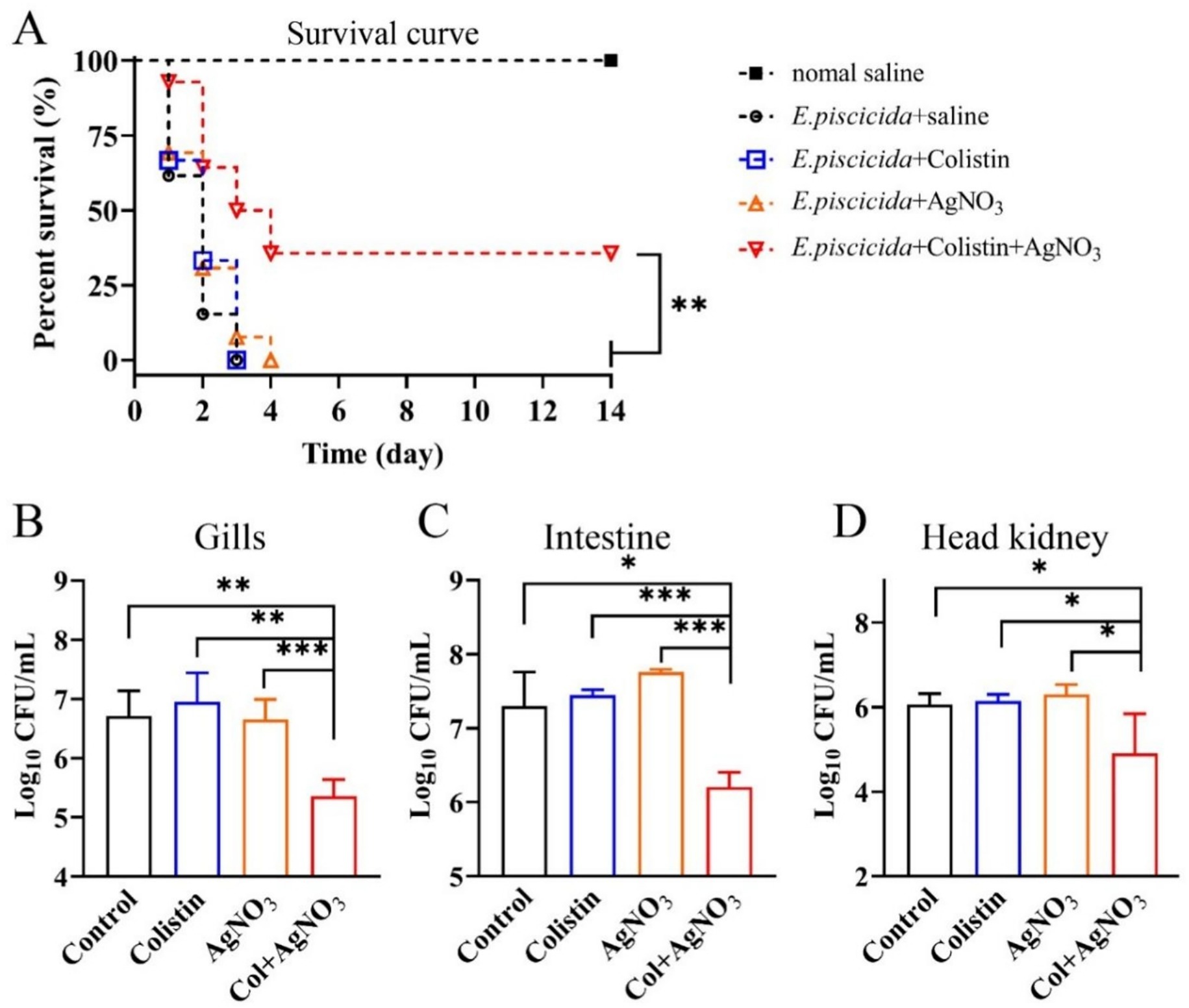 Figure 9. AgNO3 potentiates the bactericidal efficacy of colistin in vivo. (A) Survival curve of E. piscicida infection zebrafish (n ≥ 9) treated by colistin (8.0 mg/kg), AgNO3 (1.5 mg/kg), or their combination (8.0 + 1.5 mg/kg). (B–D) Bacterial burdens in the gill, intestine, and head kidney of a zebrafish infection model 48 h post infection with different treatments (n = 5). The statistical differences of zebrafish survival rates and bacterial loads were calculated by log-rank (Mantel–Cox) test, and Mann–Whitney U test, respectively. (*p < 0.05, **p < 0.01, and ***p < 0.001).