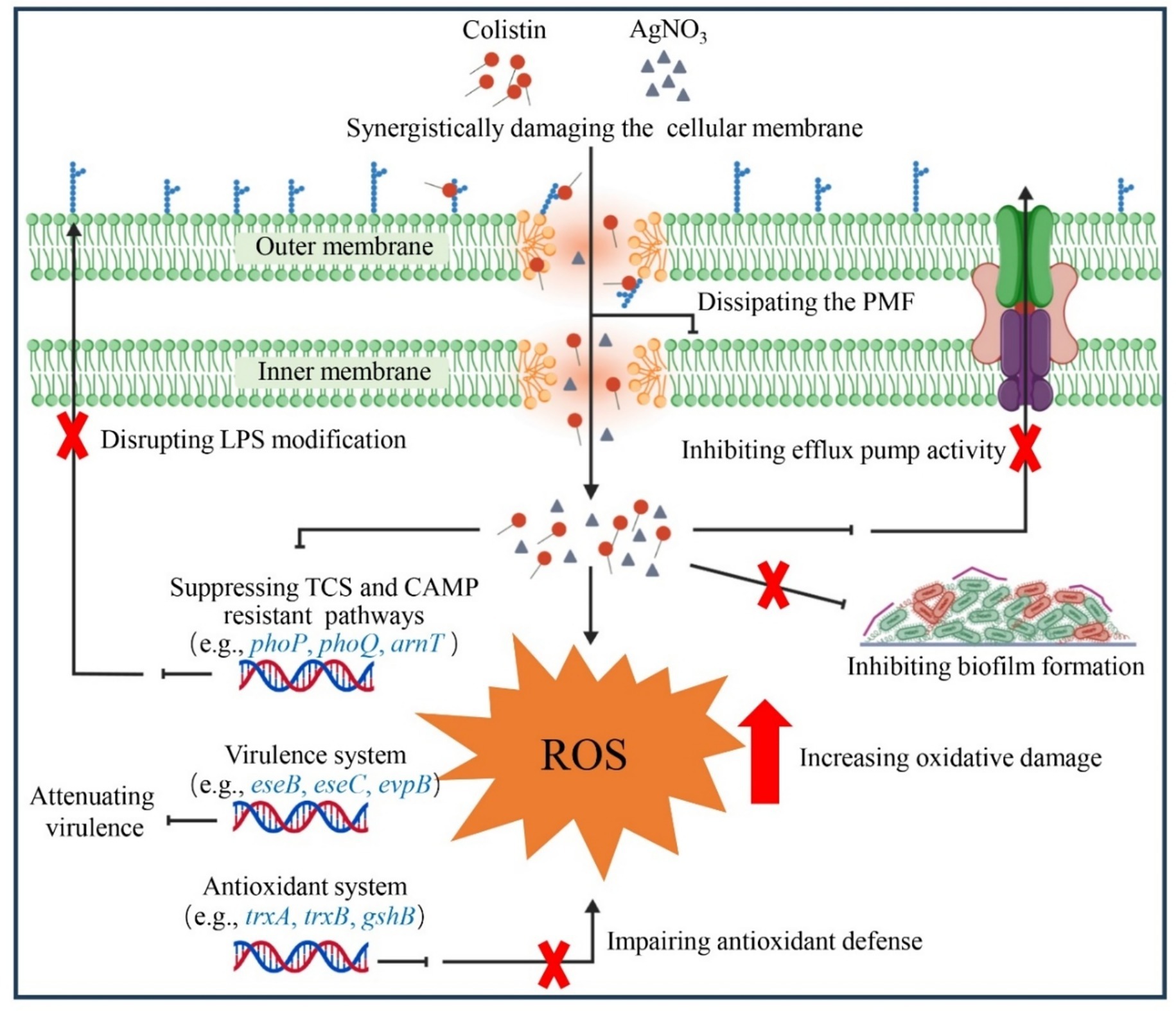 • Silver nitrate potentiates colistin’s membrane damage ability and exacerbates oxidative stress.