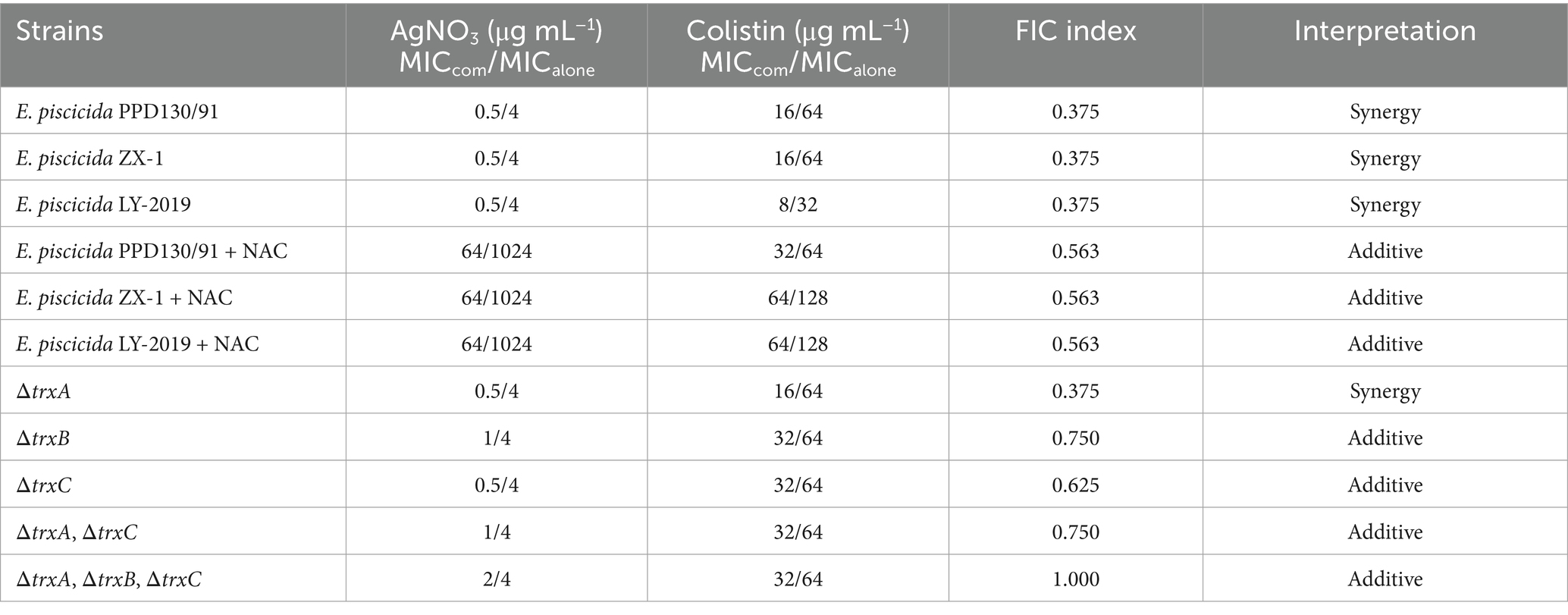 Table 1. FICi values for colistin/silver nitrate combinations against three selected E. piscicida isolates and trx mutants.