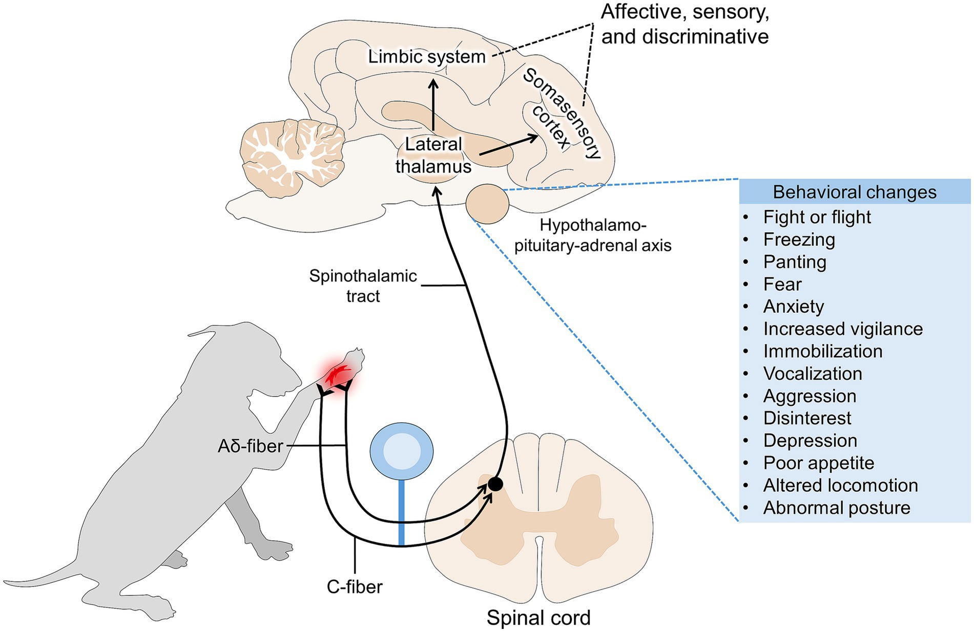According to the neurobiology of pain, the activation of peripheral nociceptors (nerve fibers specialized in detecting noxious stimuli) and their projection to the brain results in the conscious perception of pain by the somatosensory cortex (Figure 1), also known as the affective component of pain (18–21). Pain demands attentiveness from animals. In consequence, this triggers several active or passive, defensive or reactive behavioral and body posture changes to prevent further damage and promote recovery (6, 22, 23). Due to the neurobiological association between pain processing and both behavioral and body posture changes, these aspects have been integrated into pain assessment scales for domestic mammals, which categorize pain by its intensity and duration (24–26). Additionally, characterization of pain requires consideration of the medical condition (e.g., surgical, traumatic, pathological, physiological) and the anatomical region (e.g., lumbar, abdominal, limbs) to objectively associate certain behaviors with pain (27).