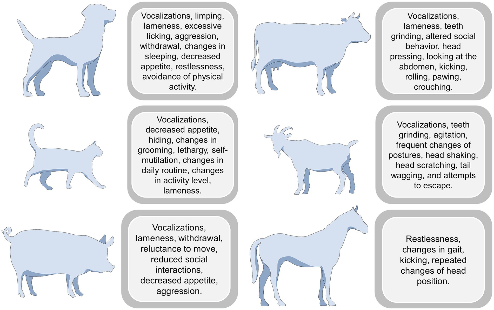 Evaluating the behavioral responses of animals when experiencing pain is considered one of the main noninvasive methods to assess its affective component (34). As previously mentioned, pain-related behaviors in domestic mammals comprise a wide range of activities to reduce the discomfort caused by pain, such as protecting the injured area (35). As mentioned by Camps et al. (36), both losing the presentation of normal behaviors and developing abnormal ones are considered signs of pain. Among the main reported signs in animals experiencing pain are reluctance to move, depression, sleep disturbances, loss of appetite, restlessness, frequent vocalization, licking, biting, scratching, self-mutilation, anxiety, irritability, and aggressiveness (Figure 3) (25, 26, 37–43).