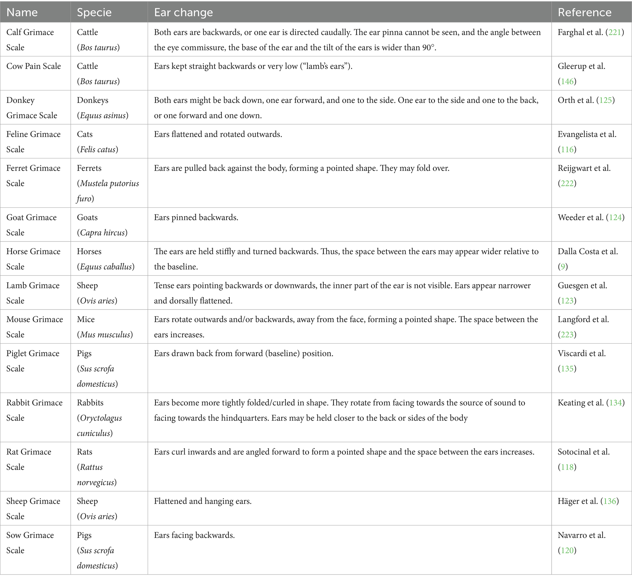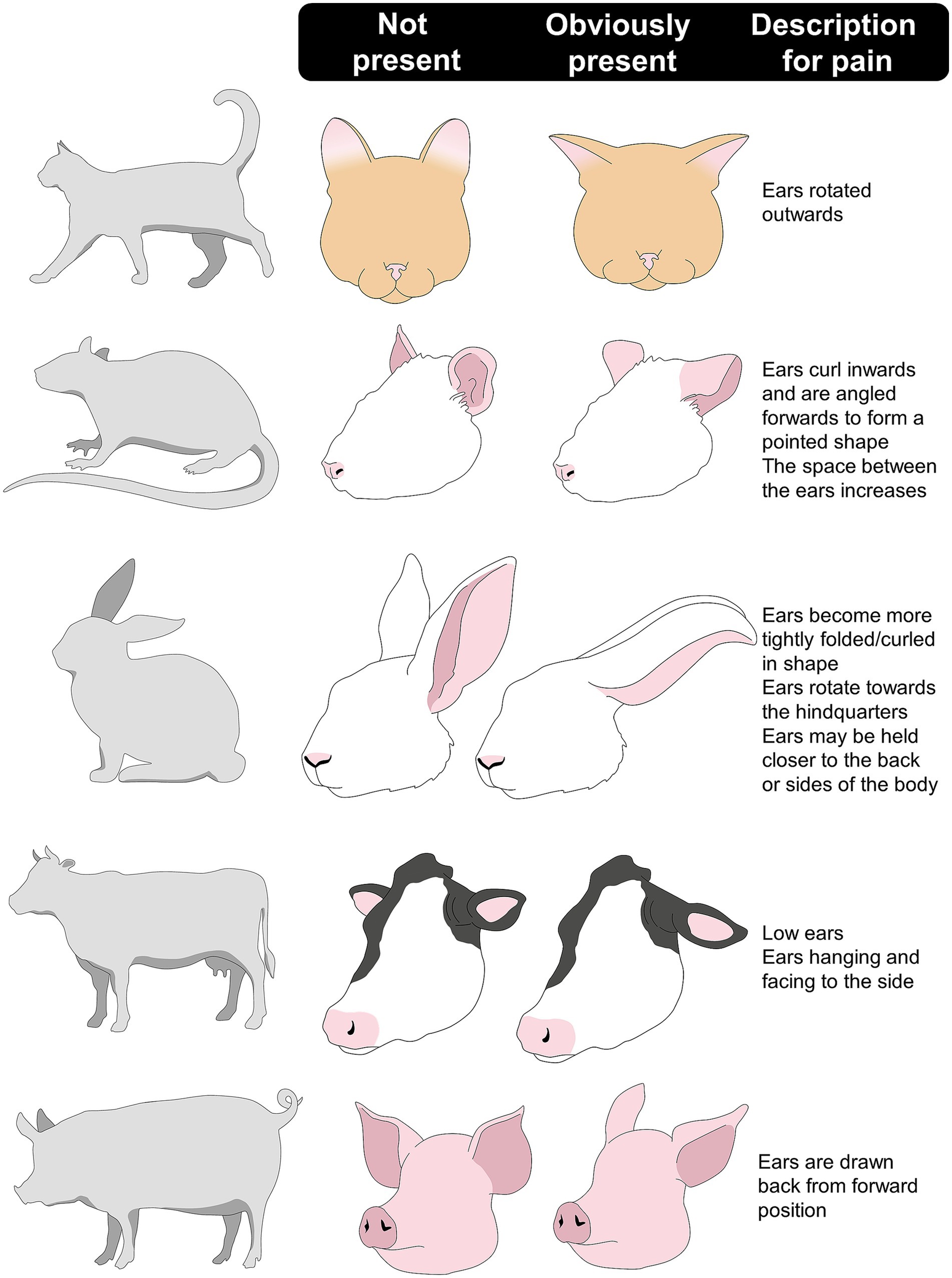 The importance of ear posture as an indicator of pain in animals is reflected in the current scales that consider it as one of the most noticeable changes when animals are exposed to a noxious stimulus. These scales have been adapted to cats (116), mice (117), rats (114, 118), rabbits (119), pigs (120, 121), sheep (122, 123), goats (124), horses (9), donkeys (125), and cows (126) (Table 1). Although the change and position depend on the species and distinct anatomy, several similarities have been found (125, 127–129). When animals experience pain, stimulation of the auricular muscles causes flattening or retraction of the ears in all species (129–131). For example, a cat with severe pain shows ears that are markedly rotated outwards (132). Rats and mice in pain show ears that are curled, pointed, and/or angled forward or outward (118, 133). For rabbits, ears tightly folded against the neck, pulled back, and flattened are present when the animal is perceiving severe pain (134). Similarly, in farm species such as piglets and goats, severe pain is characterized by the ears drawn back from the forward position and hanging (124, 135, 136), which has also been reported in horses, donkeys, and cows (9) (Figure 5) (109, 118, 132–134, 137, 138).