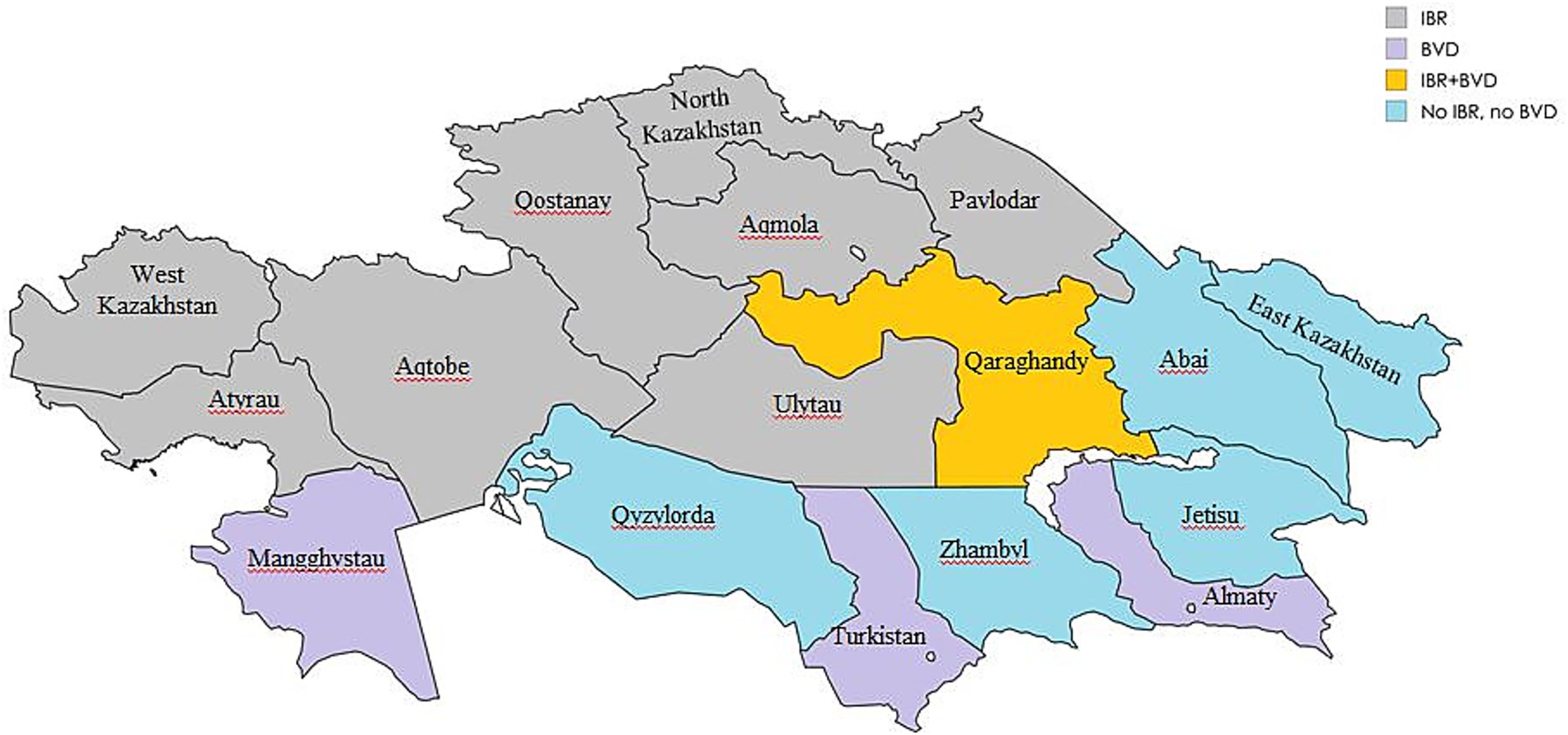 In Kazakhstan, IBR and BVD control strategies have depended on imported vaccines from Russia and the United States (20). Nevertheless, recent seroepidemiological studies (21, 22) have indicated ongoing circulation of both BoHV-1 and BVDV among cattle herds across various regions of the country (Figure 1).