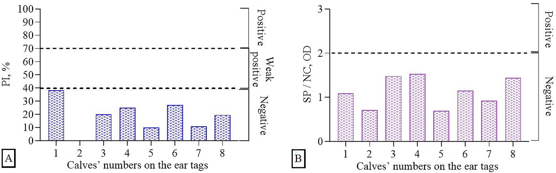 Before vaccination, serum samples were collected from 8 calves and tested for the presence of Abs to BoHV-1 and BVDV using commercial ELISA kits (Figure 2). It was found that all samples (n = 8) were negative for the IBR virus, i.e., they did not have specific Abs, since the mean of percentage inhibition (PI) values was ≤40%. In the studies of samples for the presence of Abs to the BVD virus, the absence of Abs was also revealed, since the ratio of the optical density of the sample (SP) / the optical density of the negative control (NC) was < 2. Thus, prior to immunization (day 0), no specific Abs against BoHV-1 and BVDV were detected, confirming the absence of pre-existing immunity.