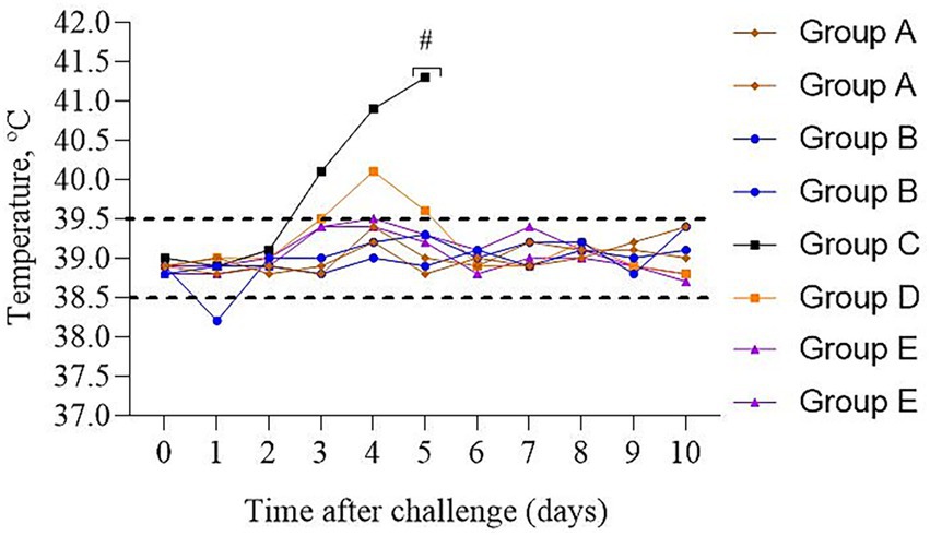 Figure 4. Dynamics of the temperature changes in calves after experimental challenge. Group A – vaccinated, challenged with BoHV-1; Group B – vaccinated, challenged with BVDV; Group C – unvaccinated, challenged with BoHV-1; Group D – unvaccinated, challenged with BVDV; Group E – unvaccinated, unchallenged; # – calf euthanasia. Dotted line – normal physiological temperature range for calves (43).