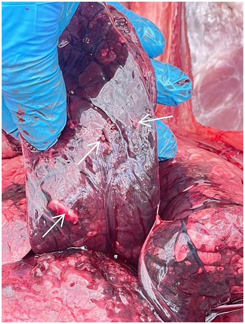 In contrast, the unvaccinated calf from Group C had a cough and sneezing on the 2nd day, and inflammation of the mucous membrane of the eye, loss of appetite, and a body temperature of 40.1 °C were noted on the 3rd day. A fever of 41.3 °C and a severe cough were recorded on the 5th day. Due to the deterioration in the general physiological conditions of the calf, humane euthanasia was performed to alleviate suffering. A post-mortem assessment of the respiratory system was performed (Figure 5). Visible pathological changes were found in the lungs, round, dense nodular formations. The temperature of calf from Group D increased on the 4th day; however, no other clinical signs were found, as in Group C.