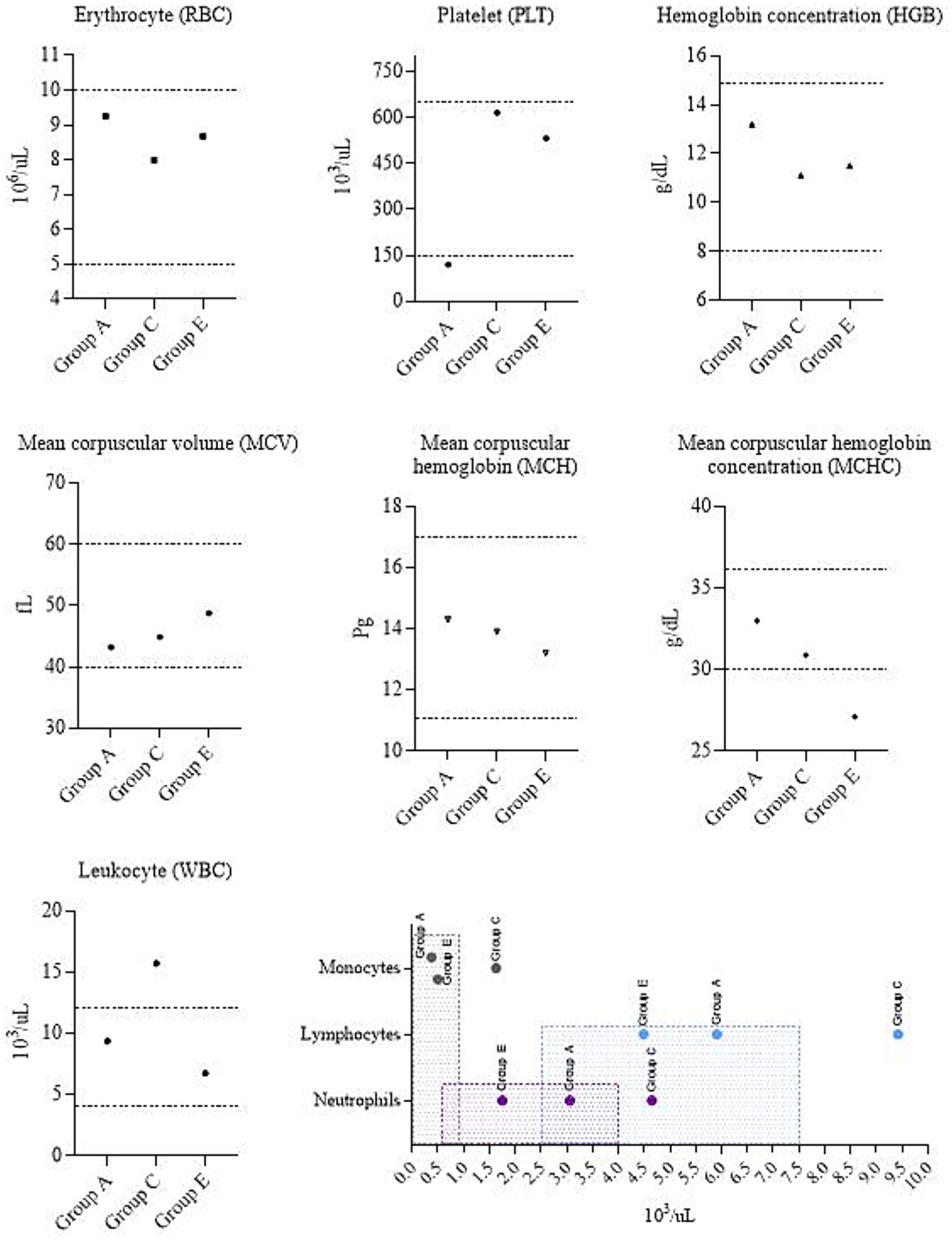 Figure 6. Complete blood count. Group A – vaccinated, challenged with BoHV-1; Group C – unvaccinated, challenged with BoHV-1; Group E – unvaccinated, unchallenged. Dotted lines and shaded areas represent reference values (50).