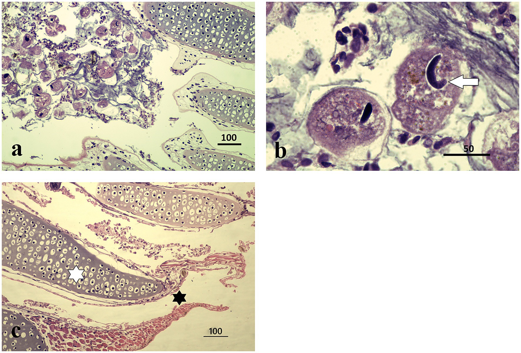 Figure 2. Histopathological features of I. multifiliis infection in S. salamandra. (a) Parasite presence in gill tissue, distributed within epithelial layers; protozoa are attached to the external cell layers without affecting the cartilaginous structure. Magnification ×100, scale bar 100 μm. (b) Close-up of a trophont, illustrating characteristic morphology and interaction with host tissue. Magnification ×1000, scale bar 50 μm. (c) Healthy gills of an individual from other locality, at the center of each gill filament lies a cartilaginous core providing structural support (white asterisk). Surrounding this core is a thin layer of epithelial cells specialized for gas exchange (black asterisk). This epithelium is primarily made up of pavement cells, ciliated cells, and mitochondria-rich cells; magnification ×100, scale bar 100 μm.