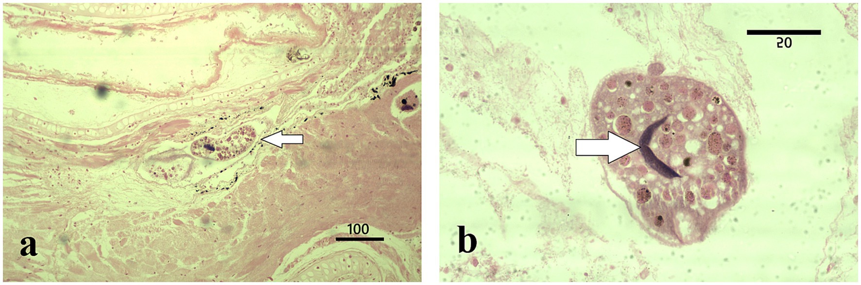 Figure 3. Histopathological features of I. multifiliis infection in R. temporaria. (a) Parasite presence in gill tissue (arrow); the cellular layers adjacent to the parasites are altered by a state of incipient autolysis. Magnification ×100, scale bar 100 μm. (b) Close-up of a trophont, illustrating characteristic morphology with a C-shaped nucleus (arrow) and interaction with host tissue. Magnification ×1000, scale bar 50 μm.