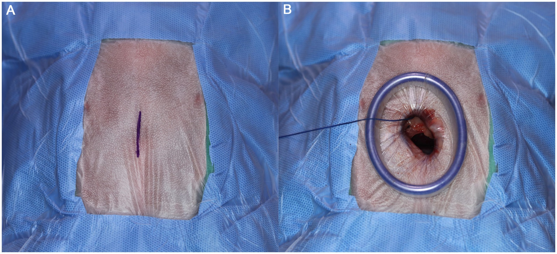 Each cadaver was positioned in the ventrodorsal (VD) recumbency on a manually adjustable tilting surgical table (CUBI small, Tabtech s.r.o., Czech Republic), with the surgical field shaved from the first rib to the umbilicus. The forelimbs and hindlimbs were secured to the table, and the surgical field was draped to the center of the xiphoid process (Figure 1A). A 2.5-cm midline skin incision was made over the xiphoid process. Following blunt dissection of subcutaneous tissue, the xiphoid process was identified and used as a landmark. Dissection continued toward the pleural cavity using fingers or Metzenbaum scissors. Upon entering the pleural space, a single-port wound retractor (Lapsingle; Sejong Medical, Seoul, Korea) was inserted (Figure 1B). The Lapsingle consists of a wound retractor and a detachable multiport lid, which together form a single-port access system. The wound retractor provides a 64-mm wound diameter, and the lid includes one 12-mm and three 5-mm ports compatible with both 10-mm and 5-mm endoscopes.