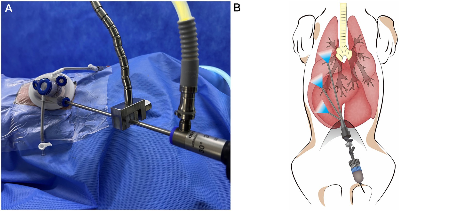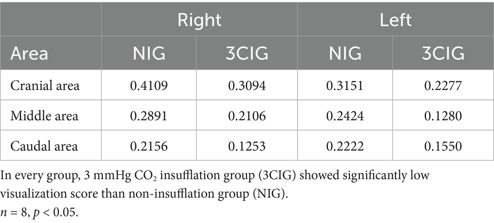 The table was tilted of 30° toward one and then the other side to facilitate visualization of the contralateral target hemithorax. The same angle was maintained for both right and left evaluations and was identical between the non-insufflation and 3 mmHg CO₂ insufflation conditions. The lid of the single-port access device was secured, and mechanical ventilation was initiated with a peak inspiratory pressure (PIP) of 15 cmH₂O, respiratory rate (RR) of 20 breaths per minute, and a positive end-expiratory pressure (PEEP) of 3 cmH₂O. A 5-mm laparoscopic scope (WA4KL530; Olympus, Tokyo, Japan) was introduced through a single port. Using retro-illumination as a guide, a needle was inserted into the thoracic cavity at the midpoint of the second intercostal space to visualize the cranial portion of the right pleural cavity. Care was taken to avoid lung contact and prevent iatrogenic pneumothorax. Once the needle was correctly positioned, the camera angle was adjusted to center the needle within the field of view. The laparoscope was stabilized using a flexible arm (Figure 2A). The camera was then retracted posteriorly until the lung edge appeared at the lower margin of the visual field. After confirming optimal positioning, video recording was initiated. At least three complete respiratory cycles were captured before recording was paused. Images were saved as the non-insufflation group (NIG). Subsequently, the pleural cavity was insufflated to 3 mmHg CO₂, and the recording procedure was repeated. These images were saved as the 3 mmHg CO₂ insufflation group (3CIG). This method for quantitative visualization assessment was adapted from the approach described by previous study (12). The process was repeated at the second, fifth, and seventh intercostal spaces, corresponding to the cranial, middle, and caudal pleural segments, respectively, to visualize the entire right pleural cavity (Figure 2B). After completing the right-side assessment, the table was tilted to assess the cranial, middle, and caudal aspects of the left hemithorax. This procedure was repeated to assess the cranial, middle, and caudal aspects of the left pleural cavity.