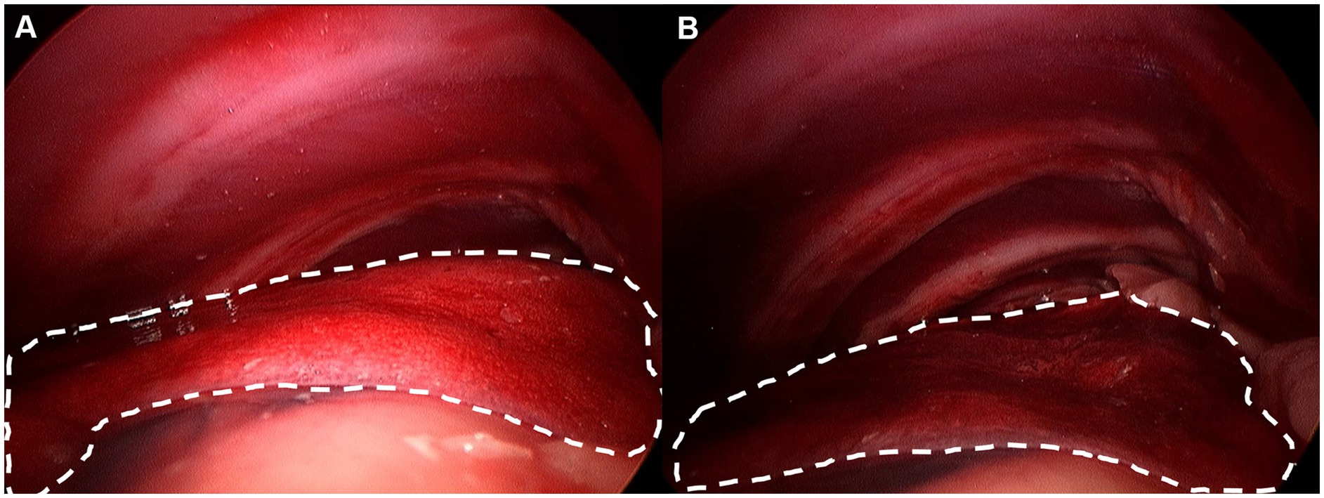 Captured images were processed using ImageJ software (version 1.49; National Institutes of Health, Bethesda, Maryland, United States) to quantitatively evaluate thoracic cavity visualization. For each frame, the total endoscopic field area was delineated, and the lung margins were manually traced along the visible lung lobes (Figure 3). This procedure was repeated three times, and the average was designated as the zone of interest. The traced lung area was divided by the total frame area to calculate the visual obstruction ratio, also referred to as the lung collapsing ratio, representing the percentage of the endoscopic view occupied by lung tissue. As in previous studies, the intrathoracic working space was quantitatively evaluated using this ratio, with lower obstruction values indicating a larger available working space (12). This parameter was used to compare visualization between NIG and 3CIG.
