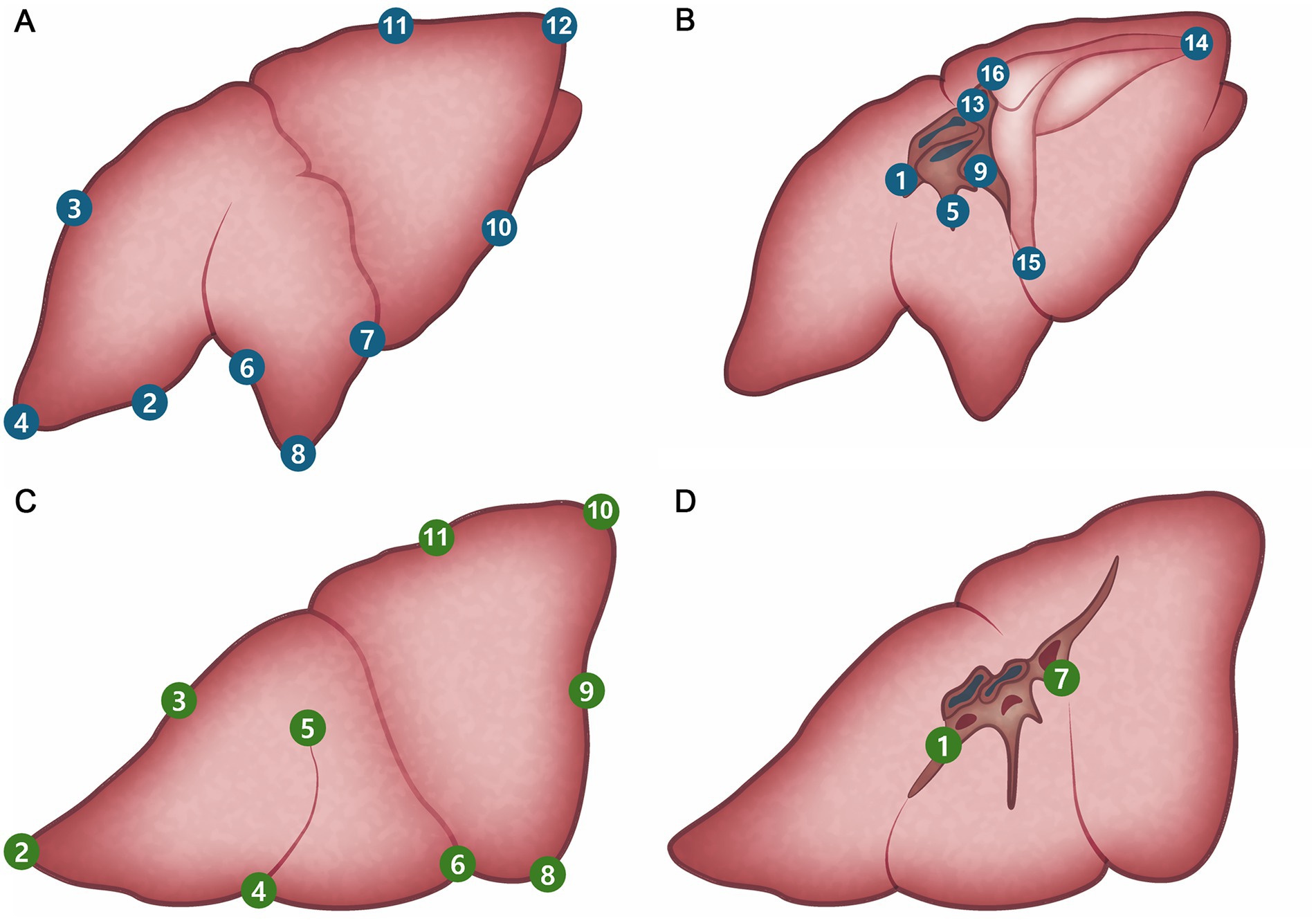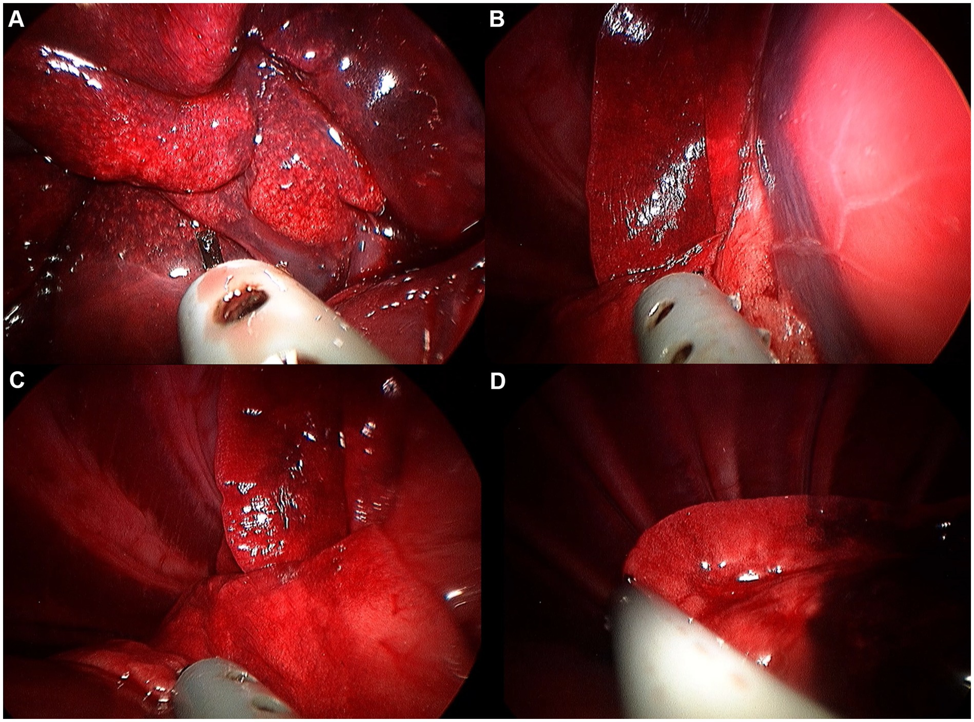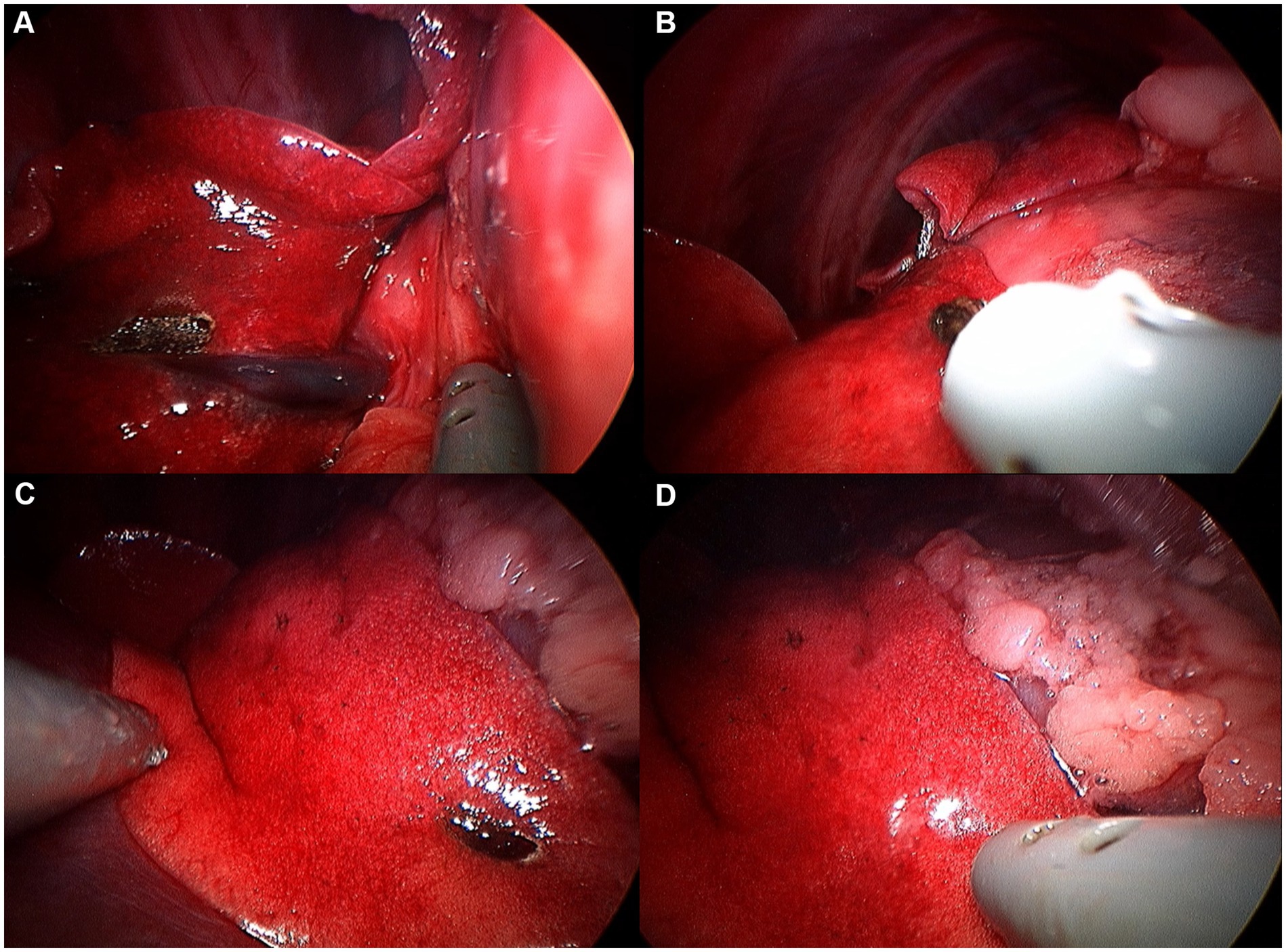 Figure 10. Image of accessory lobe exploration procedure. (A) Hilus. (B) Caudal apex. (C) Ventral apex. (D) Dorsal apex.