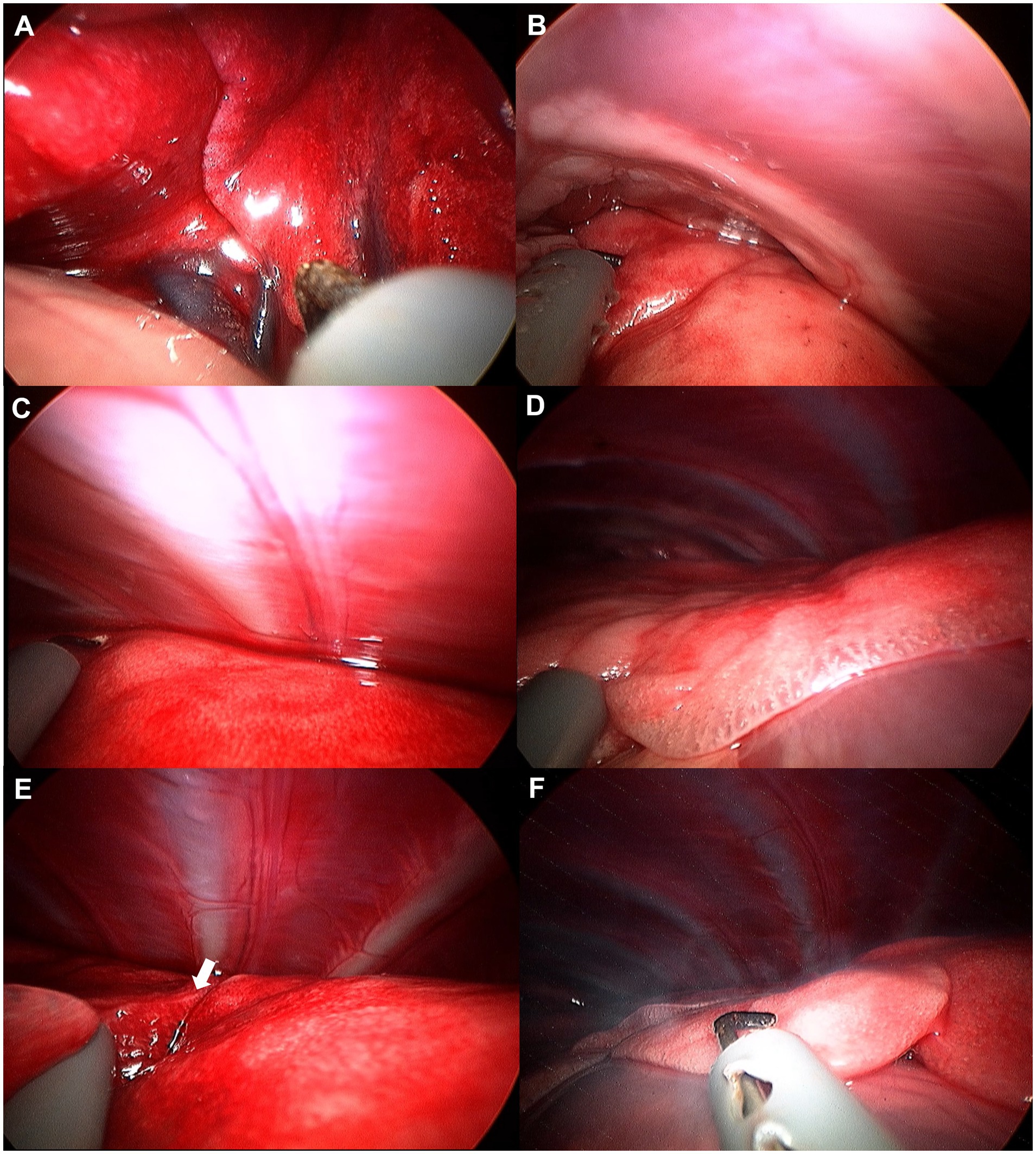 Figure 5. Image of left cranial lobe exploration procedure. (A) Hilus. (B) Cranial apex of cranial part. (C) Dorsal edge. (D) Cranial apex of caudal part. (E) Bifurcation (white arrow). (F) Caudal apex of caudal part.