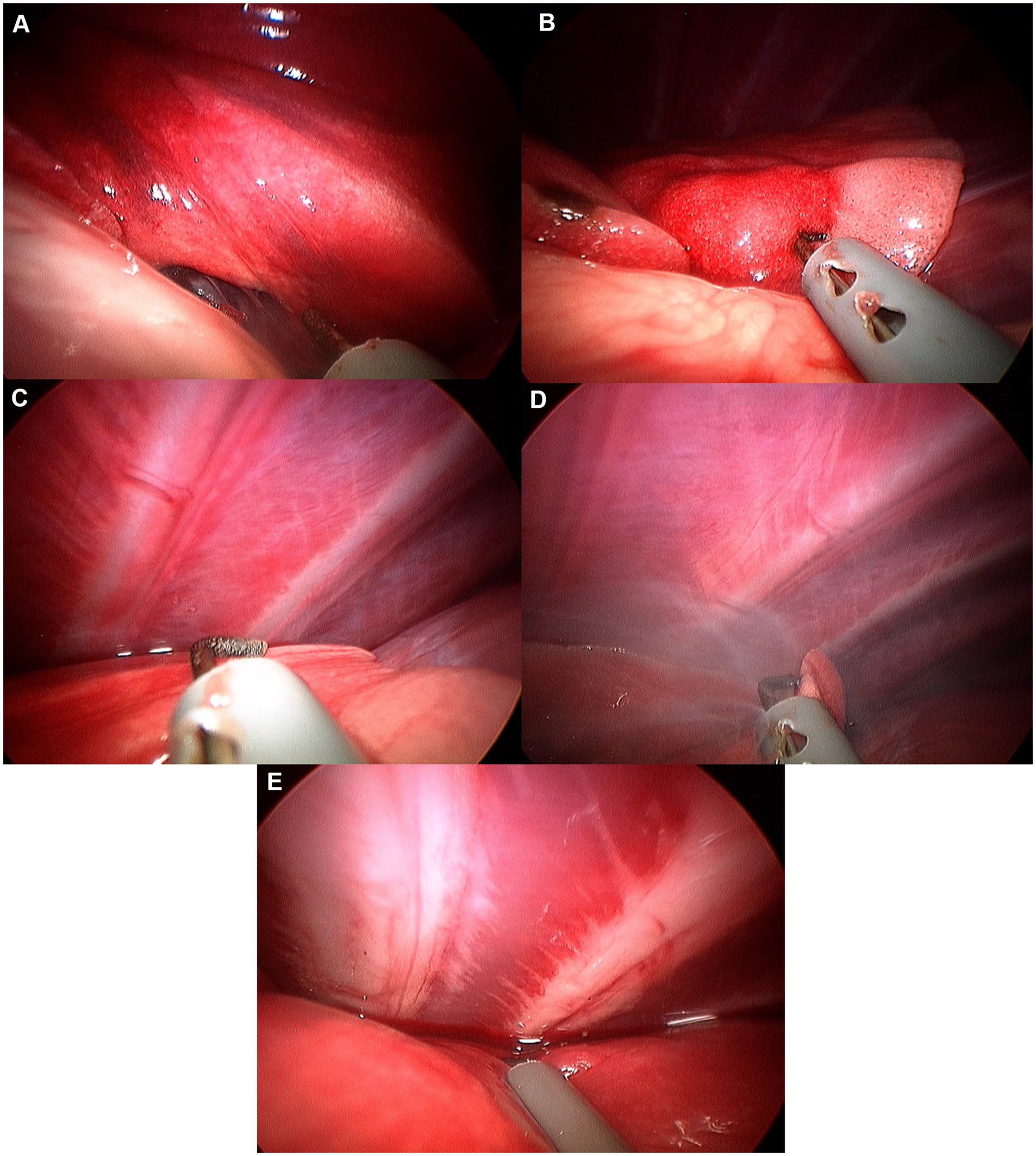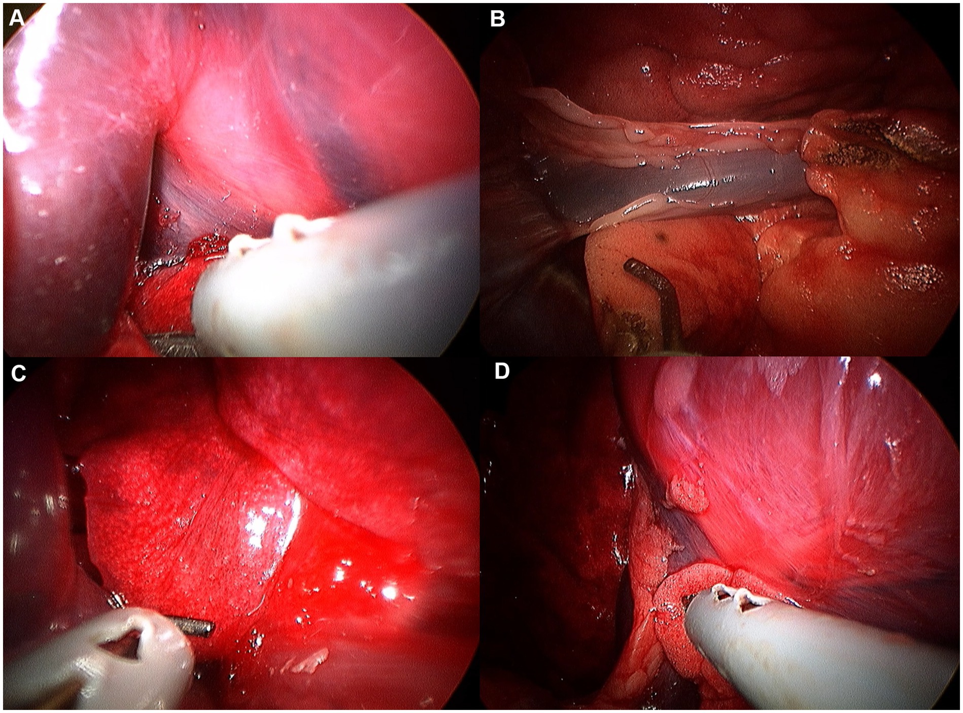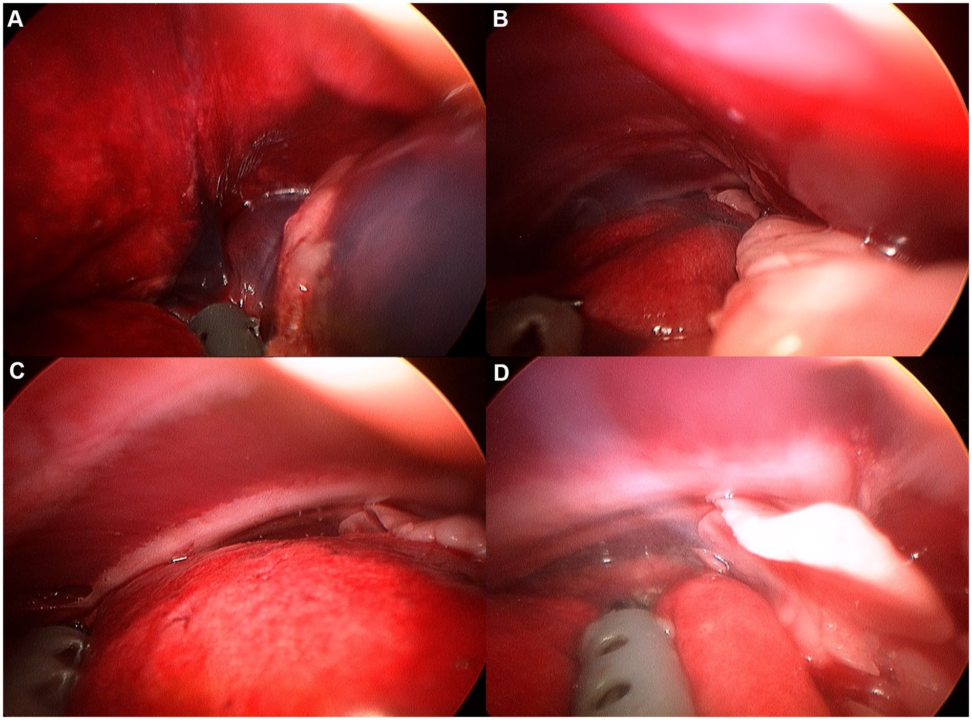 Accessory lung lobectomy was performed following exploration under 3CIG (Figure 11). The lungs were gently retracted using non-crushing forceps to avoid parenchymal injury. To access the accessory lung lobe, the mediastinal recess was carefully opened using Metzenbaum scissors and blunt dissection with endoscopic forceps. The pulmonary ligament attached to the accessory lung lobe of the mediastinum was dissected using Metzenbaum scissors or a laparoscopic monopolar instrument to preserve the surrounding structures. Once the accessory lung lobe was mobilized, a 2–0 polydioxanone pre-tied ligature loop (PLL) (Endoloop PDS II, ETHICON, United States) was introduced through the port. Maryland forceps were used to grasp and position the loop around the base of the accessory lobe. After confirming proper positioning in the hilar region, the loop was tightened, and the lobe was transected 5-10 mm distal to the ligature using Metzenbaum scissors (17, 19). To assess air leakage, the thoracic cavity was filled with sterile normal saline, and the lungs were ventilated through the circuit for 30 s at a peak inspiratory pressure of 20 cmH₂O. The resection site was observed endoscopically, and the procedure was completed after confirming the absence of air leakage.