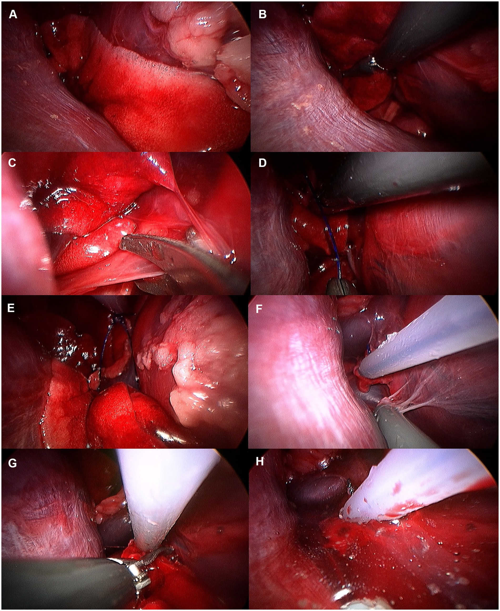 Figure 11. Image of accessory lung lobectomy using pretied ligature. (A) Accessory lung lobe before procedure. (B) Lung lobe was handled with non-crushing forceps (e.g., babcock forceps). (C) Pulmonary ligament was cut using metzenbaum scissors or monopolar device. (D) Pretied ligature was handled using maryland forceps or right angle forceps. (E) Lung lobe was passed through the ligature loop. (F) After making sure lung lobe was totally passed through the ligature loop, ligature was tied. (G) Tied lung lobe was cut 1–2 mm distal to the ligation. (H) Leak test was performed before closure.