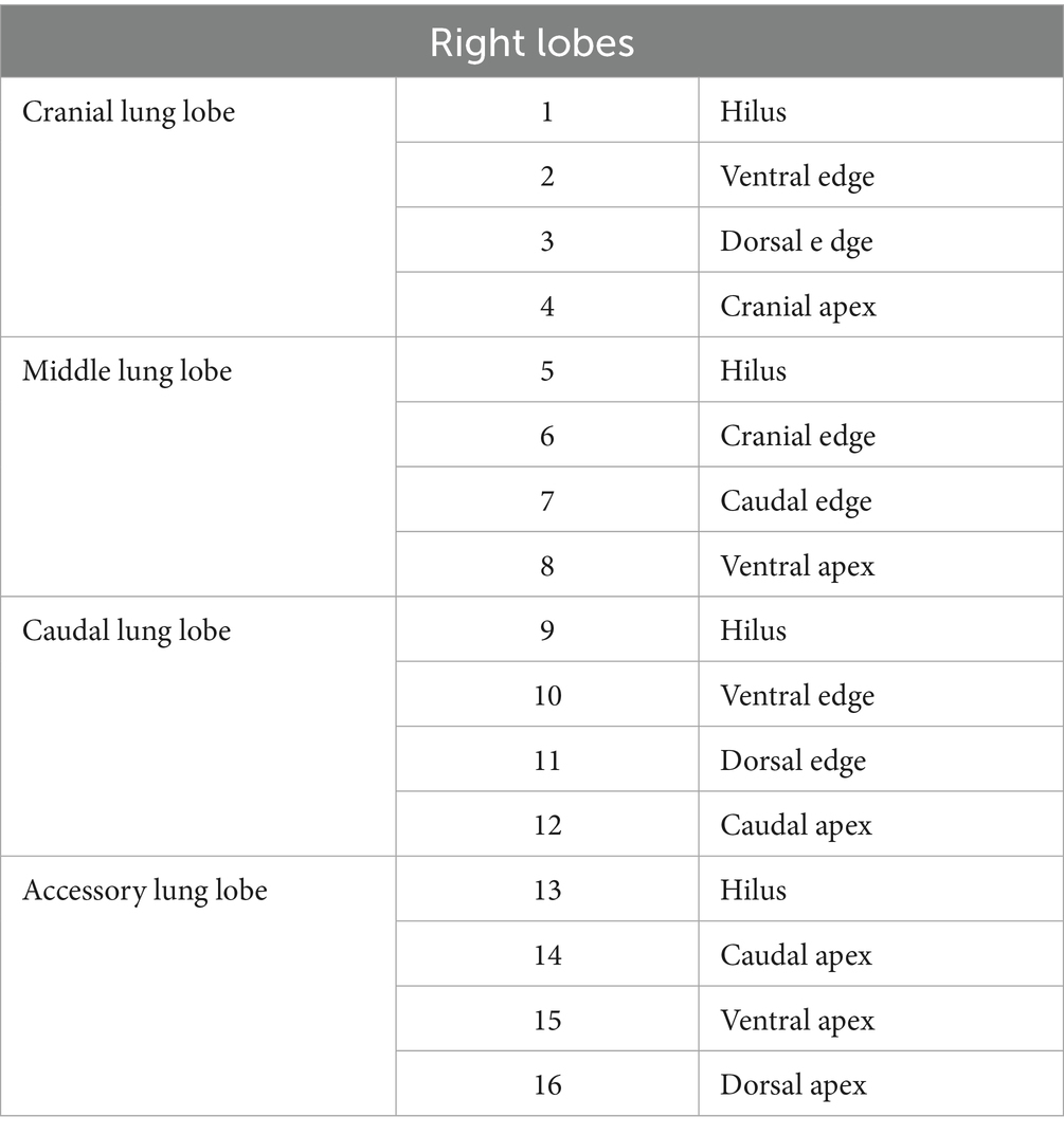 A necropsy was performed upon completion of the procedures. Lung lobes were separated from the trachea, and marked areas were examined and scored. An area was scored as 1 if marked in the correct position and 0 otherwise. The lateral side of the dorsal margin was scored as 1 if marked at more than 2/3 of the lobe’s height. The exploration score (ES) was calculated by summing the marked score and the time score per lobe, then dividing by twice the marking score to compare lobes. Values approaching 1 were considered indicative of easier exploration, whereas values approaching 0 indicated greater difficulty. After ES assessment, an endotracheal tube was placed in the trachea and sealed using cable ties. The tube was then fitted with a sphygmomanometer, and the lobes were submerged in water to quantitatively assessed leakage at physiological lung pressure (15 mmHg).