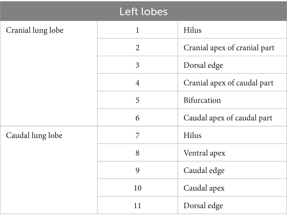 The exploration procedure was performed from the left to the right hemithorax. Starting with the left cranial lobe, each predesignated site (Figure 4; Tables 1, 2) was marked using a laparoscopic monopolar instrument in coagulation mode, which was used only for marking. The exploration and scoring were performed only under 3CIG to obtain the quantitative results of visualization achieved with CO₂ insufflation. The cranial and caudal portions of the cranial lobe, followed by the caudal lobe, were marked sequentially (Figures 5, 6). After completing the left side, the right hemithorax, including the cranial, middle, caudal, and accessory lung lobes, was explored similarly (Figures 7–10). The time required to explore each lobe was recorded. Each marking point was allotted 1 min; therefore, a lobe with four planned marking sites was allocated 4 min each. If the task was completed within the allotted time, the lobe received a full score of four points. If the total time exceeded the allocation, one point was deducted for every additional 2 min.