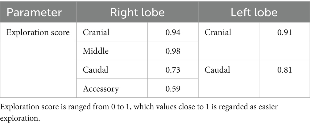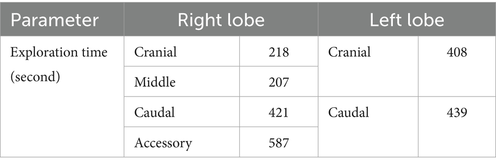 Mean exploration times and corresponding ES for each lung lobe under 3CIG are presented in Table 4. In the right cranial lobe, the mean exploration time was 218 s (range: 144–323 s), with a mean ES of 0.94. The right middle lobe was explored at 207 s (range: 157–257 s), with a mean ES of 0.98. The right caudal lobe required a mean of 421 s (range: 238–824 s) and had a mean ES of 0.73. The accessory lung lobe required the longest exploration time, with a mean of 587 s (range: 443–737), and had the lowest mean ES of 0.59. On the left side, the left cranial lobe was explored in a mean of 408 s (range: 273–534 s), with a mean ES of 0.91. The left caudal lobe required a mean of 439 s (range: 187–594 s) and had a mean ES of 0.81 (Table 5).