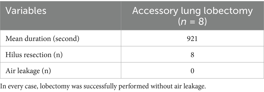 Accessory lung lobectomy was performed with a mean duration of 921 s (range: 582–1,175 s; n = 8). Hilar resection was successfully completed in all cases. No air leakage was detected during the leakage test conducted before finalizing the procedure or during necropsy (Table 6).