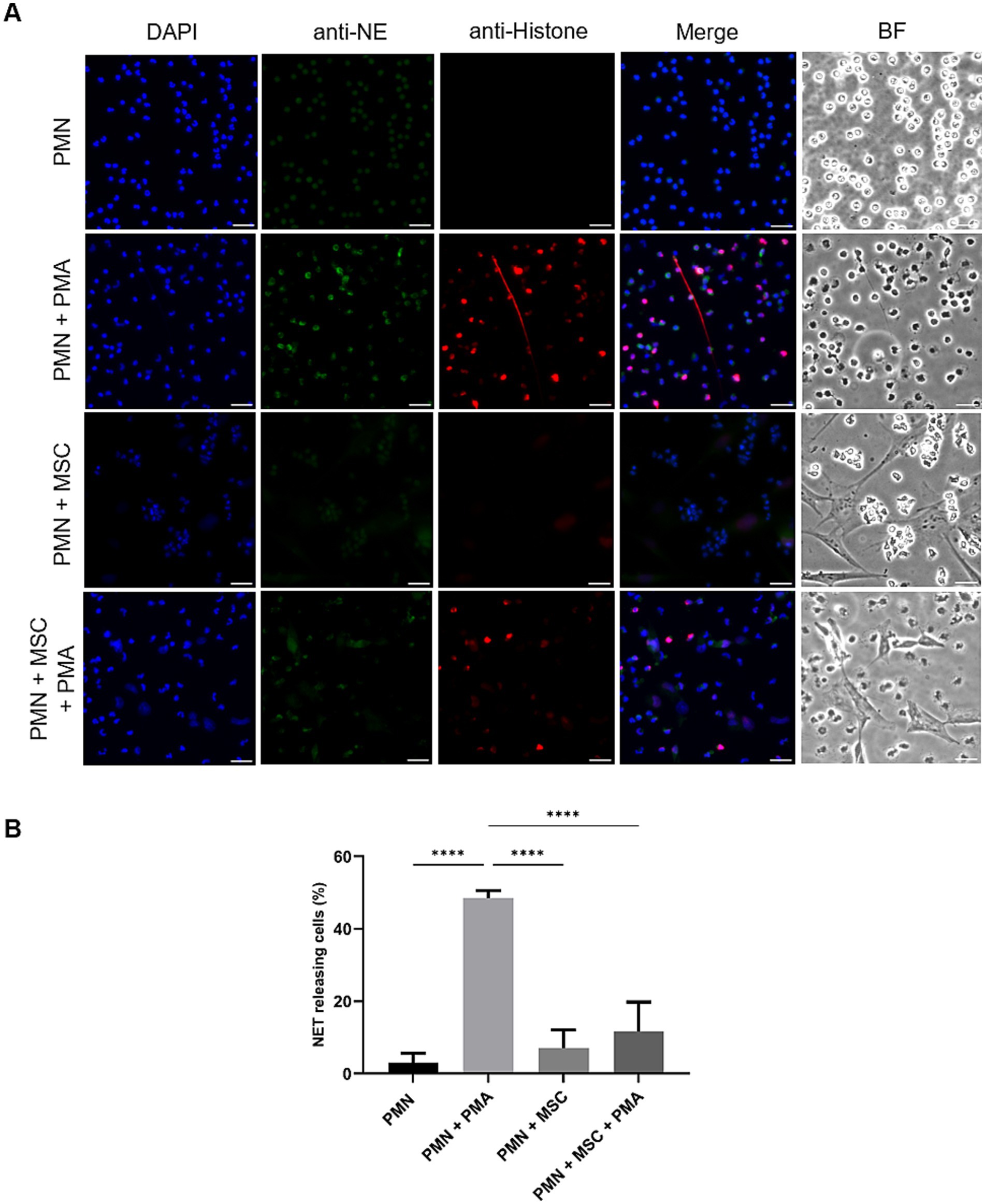 Figure 2. PMA-induced NET release by equine polymorphonuclear neutrophils (PMN) decreases in the presence of adipose-derived stem cells (ADSCs). PMN were cultured without stimuli (negative control), activated with PMA (positive control), in the presence or absence of equine-MSC for 180 min. (A) Immunofluorescence microscopy assay (IFM) analyses revealed NET structures by co-localization of decondensated DNA (DAPI, blue), neutrophil elastase (NE, green) and pan-histone (red). (B) The bar graph shows quantification of equine PMN releasing NETs. A significant difference (p < 0.05) was observed between PMA-stimulated PMN and those co-incubated with equine ADSCs and PMA. p-values were calculated by one-way ANOVA, followed by Tukey’s multiple comparison test: ****p ≤ 0.0001, ns, not significant. Scale bar = 20 μm. MSC, mesenchymal stem cell.
