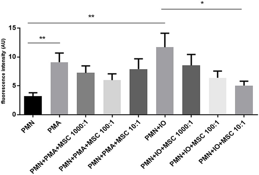 Figure 4. Inhibition of DNA release by equine polymorphonuclear neutrophils (PMN) is dependent on the adipose-derived stem cells (ADSCs) to PMN ratio. Bar graph showing fluorescence intensity of extracellular DNA, indicative of NETs released be equine PMN stimulated with PMA or ionomycin (Io) in the presence of ADSCs at different ratios. Fluorescence intensity was quantified following co-incubation with ADSCs at PMN: ADSCs ratios of 1,000:1, 100:1 and 10:1. A tendency toward reduced fluorescence signal was observed at the lowest PMN: ADSCs ratio (10:1), suggesting a dose-dependent inhibitory effect of ADSCs on NET release by equine PMN. Data represent as mean ± SD. *p ≤ 0.05; **p < 0.01. MSC, mesenchymal stem cell.