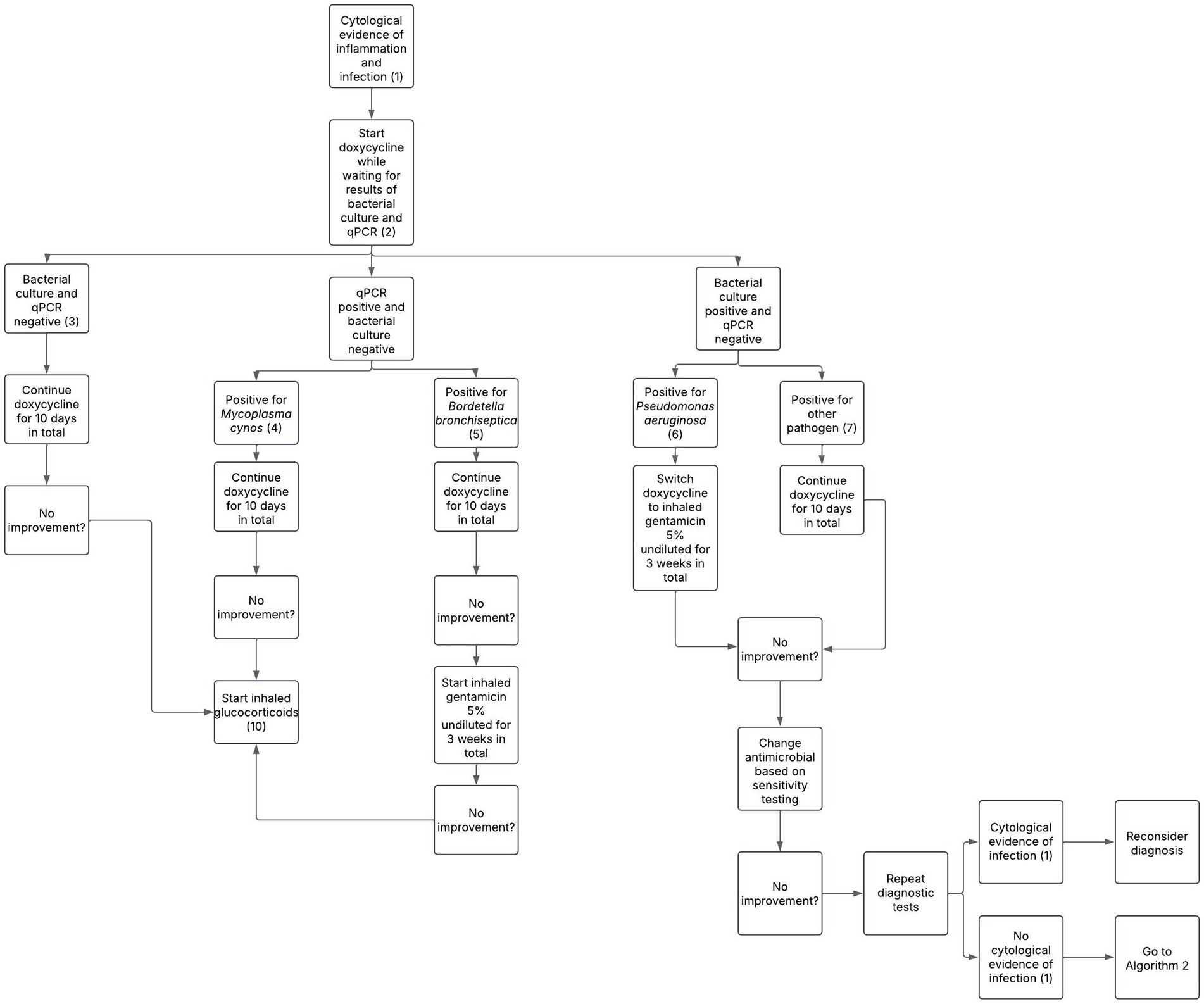 Cytological evidence of bacterial infection, evaluated either in-house when expertise is available on site or via an external laboratory, is primarily based on the identification of bacteria within the cytoplasm of airway neutrophils (intracellular bacteria) on cytological evaluation of BALF and/or bronchial brushing. When possible, bacteria should also be classified either using Gram-coloration or bacteria morphology, as this can provide useful preliminary information about the likely bacterial pathogens involved and interpretation of bacterial culture results. This criterion, used to distinguish infectious from non-infectious cases, forms the basis for selecting between the two proposed treatment algorithms (Note 1). It is essential to interpret cytological findings in the context of any recent or ongoing antimicrobial treatment, as prior antibiotic use may suppress visible cytological indicators of infection and lead to false-negative interpretations. Clinical judgment and further diagnostics should guide management in these cases.