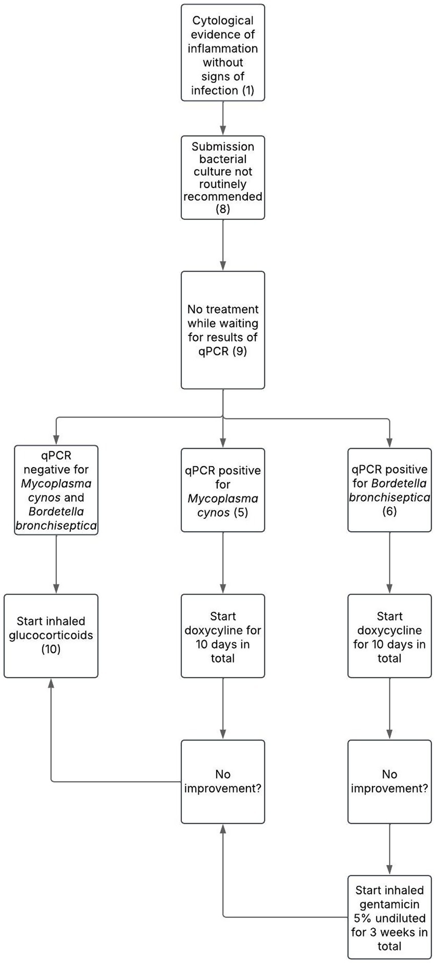 A positive qPCR result for Mc despite negative culture results, is not unexpected as Mc requires specialized culture media but can be reliably detected by qPCR (24). A Ct value below 34 is considered a positive result (25). Doxycycline is recommended as the first-line antimicrobial treatment for Mc infection in dogs (Note 4) (21). If no improvement occurs, treatment may be extended or the diagnosis reconsidered, including repeating diagnostic tests to confirm the presence of Mc or identify other respiratory pathogens (21). Fluoroquinolones and azithromycin have shown in vitro efficacy against Mycoplasma spp. and resistance to doxycycline has been documented in some Mycoplasma species in other animals (26–28). However, no resistance to doxycycline in canine Mycoplasma species has been reported (29). It is important to note that some Mycoplasma spp. may be found in the lower airways of healthy dogs, suggesting they can be part of the commensal microbiota (30). However, Mc is rarely identified in healthy individuals and is more consistently associated with respiratory disease, indicating its likely pathogenic role (30). Lack of clinical response to doxycycline suggests that inflammation, rather than infection, is the predominant cause of symptoms. This is frequently observed in chronic airway diseases such as BE and/or BM, where non-infectious inflammation may persist. In these cases, treatment should be redirected toward inhaled glucocorticoids (Note 10). Other Mycoplasma species, such as Mycoplasma canis, were not considered in this algorithm due to its currently unproven pathogenic role in canine respiratory disease (31).
