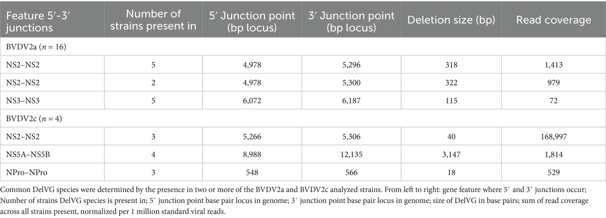 Single-point mutations in the BVDV NS2 protein are associated with viral attenuation, viability, and cytopathogenicity (51, 52). Based on the prevalence of NS2 DelVGs among BVDV2 strains observed in this study, they likely play a substantive role in BVDV2 viral pathogenesis, moderating viral infection and shaping host cellular responses. Given that DelVGs have been associated with influencing virulence, the establishment of viral persistence, and interferon stimulation in other members of Flaviviridae (20, 22, 24, 26, 53), hotspots for viral DelVG generation such as the C region in BVDV1 and now the reporting of NS2 for BVDV2 in this study become targets of interest for understanding virus–host interactions, viral evolution, as well as antiviral and vaccine development.