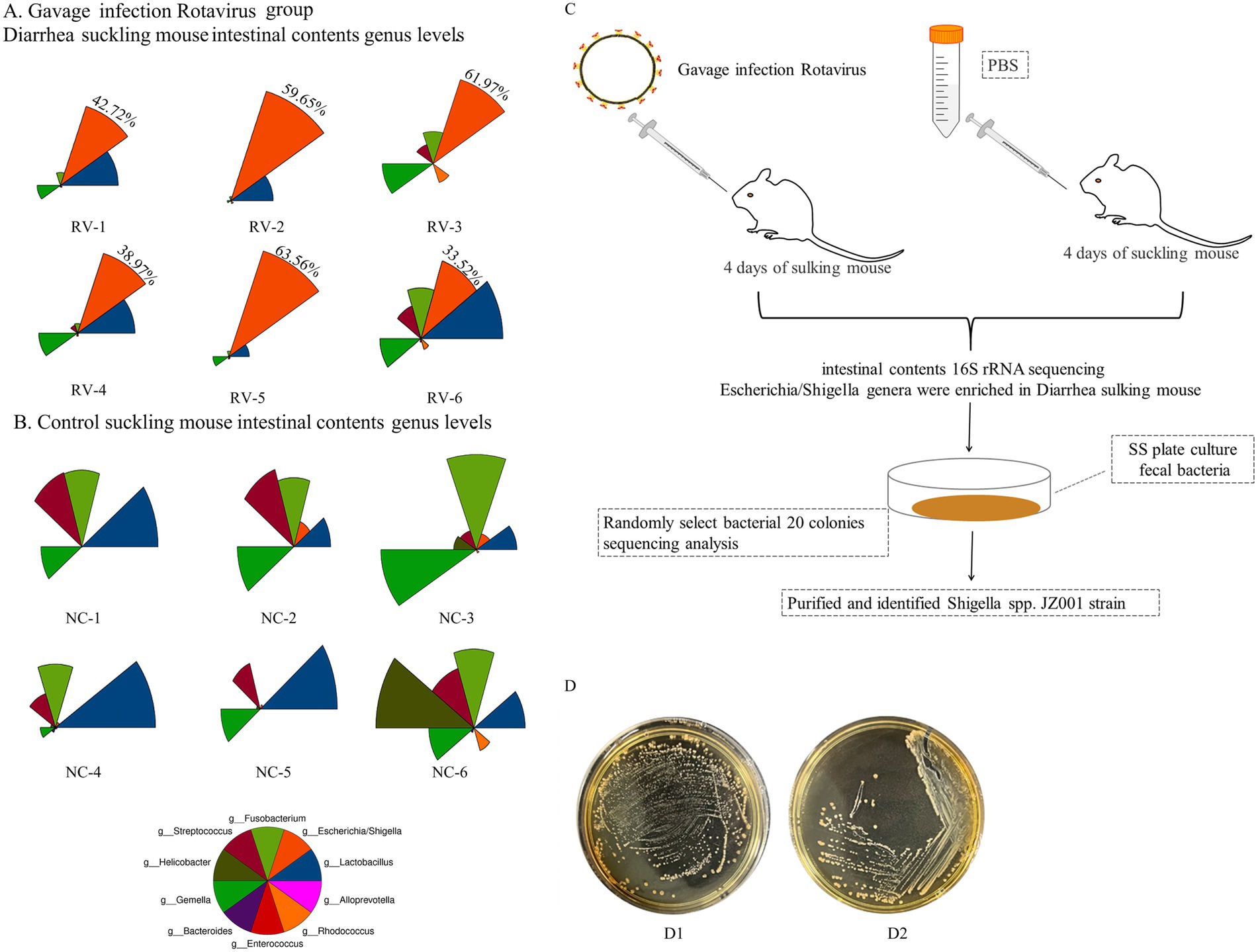Figure 1. (A,B) Show the results of intestinal microbiota analysis on fecal samples from rotavirus-infected diarrheic suckling mice (RV group) and age-matched control mice (NC group). (A) The abundance of bacterial phylotypes in the gut microbiota of fecal samples from diarrheic mice (RV group), The red color sector represents Shigella spp., and its relative percentage values are displayed in the red sector area; (B) control mice (NC group). The relative abundances of the top 10 bacterial phylotypes at the genus level via star plots (Supplementary Table S1). Star plots visualize the relative abundance of individual phylotypes within each sample: each sector, distinguished by a unique color, corresponds to one genus-level phylotype, and the radius of each sector is proportional to the relative abundance of the corresponding phylotype—with a longer radius indicating a higher relative abundance. (C) Schematic diagram of isolation method for Shigella spp. in mice. (D) D1 Mice fecal culture on SS agar plate; D2 Shigella spp. Culture in SS plate.