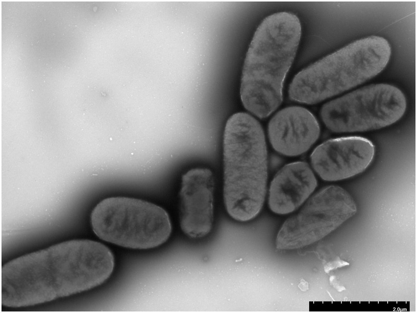 After 24 h of cultivation on standard agar medium, Shigella strain JZ001 formed semi-transparent, smooth-surfaced, circular, gray-white colonies. Examination of cell morphology (Figure 2) revealed that JZ001 cells were rod-shaped and lacked flagella.