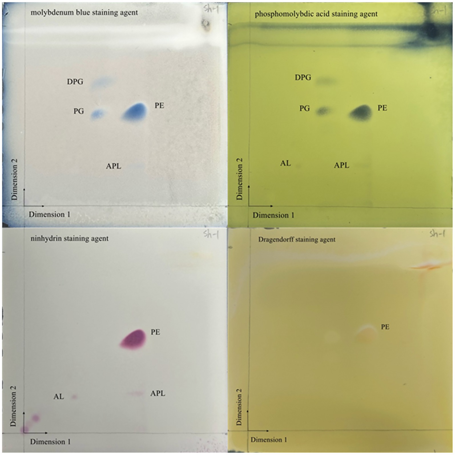 Four panels display chromatography results with different staining agents, labeled as follows: molybdenum blue shows DPG, PG, PE, and APL; phosphomolybdic acid highlights DPG, PG, PE, AL, and APL; ninhydrin reveals PE, AL, and APL; Dragendorff shows PE. Each panel is marked with Dimension 1 and Dimension 2 axes.