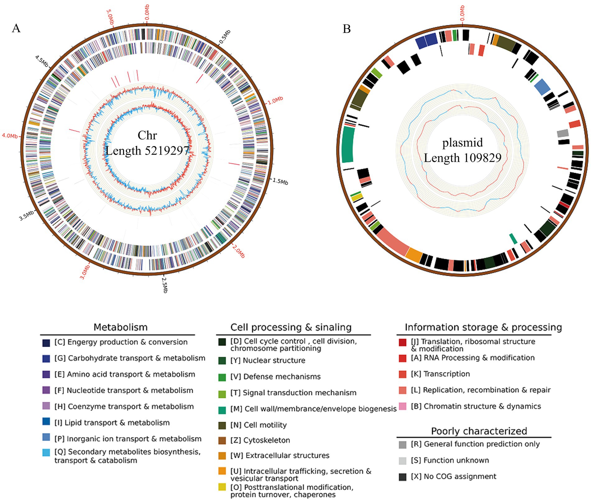 Circular genome maps depict a chromosome and a plasmid with labeled segments representing different functions, including metabolism, cell processing, signaling, and information storage. A key denotes color-coded categories. Chromosome length is 5,219,297 base pairs, and plasmid length is 109,829 base pairs.