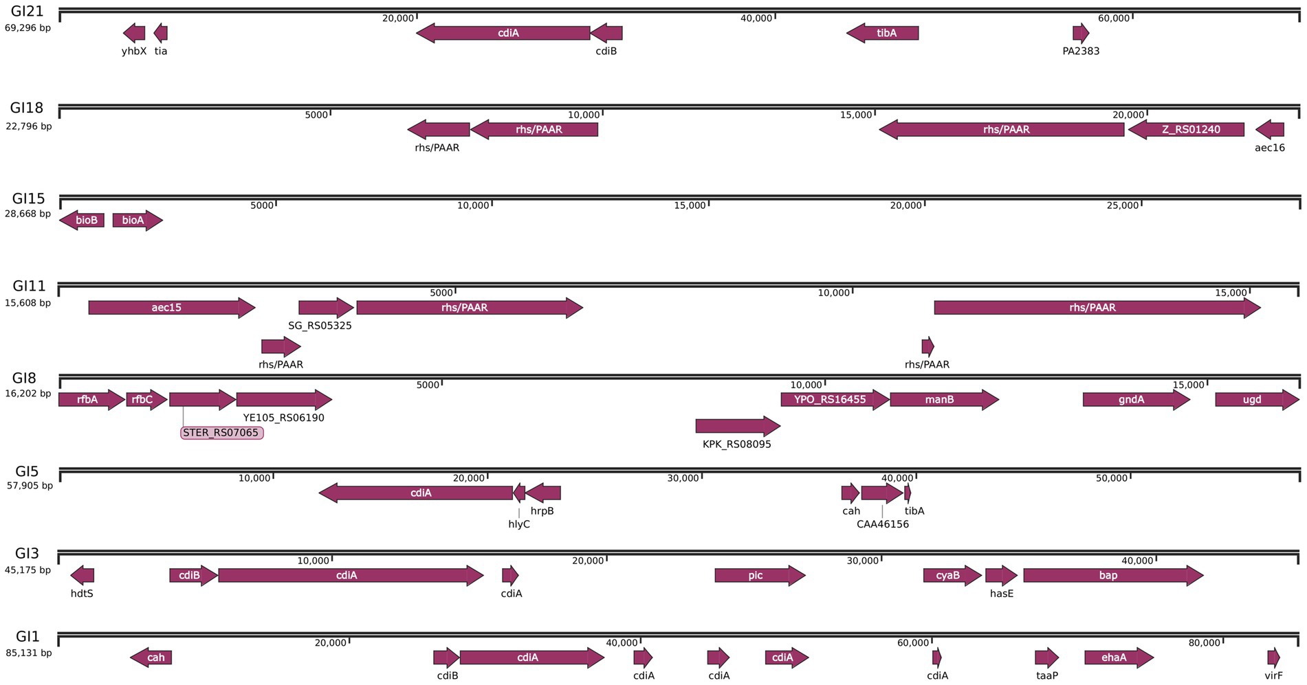 Genomic map illustration showing various gene clusters labeled GI21 to GI1, with base pair measurements ranging from sixteen thousand two hundred two to eighty-five thousand nine hundred thirty-one. Genes like cdiA, cdiB, and rhs/PAAR are highlighted with directional arrows, indicating their orientation.