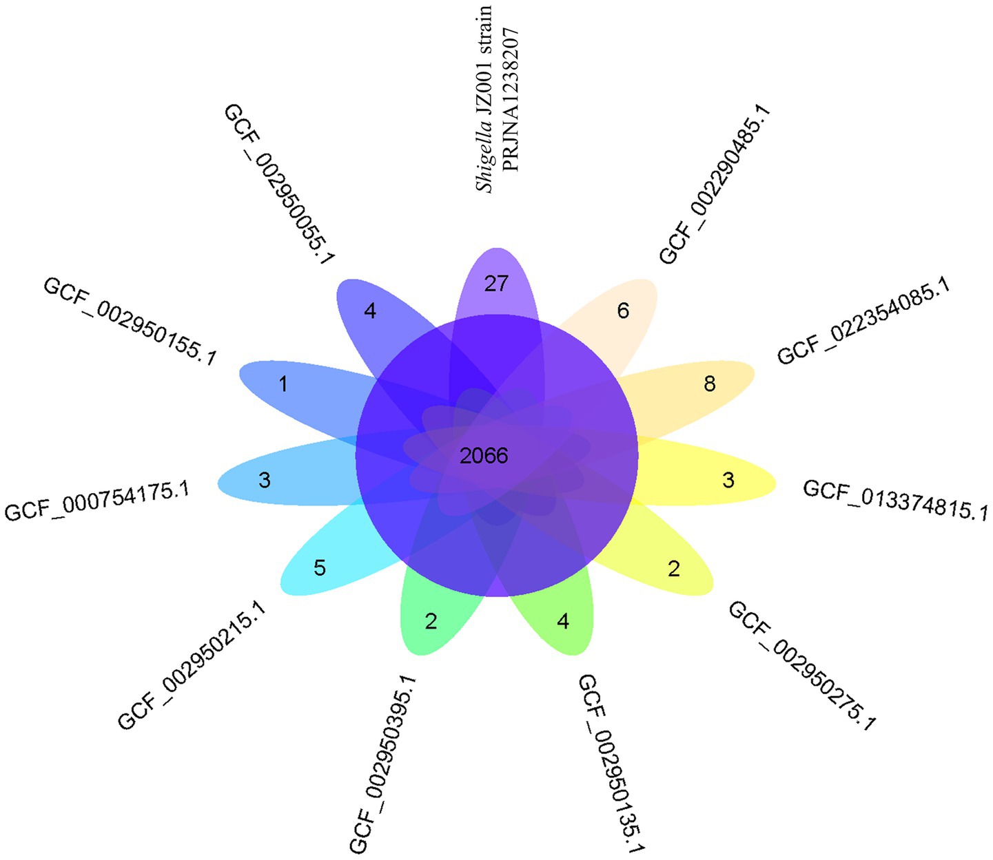Figure 6. Venn diagram showing the number of genes of orthologous CDSs shared between ten strains and Shigella JZ001 strain (PRJNA1238207).