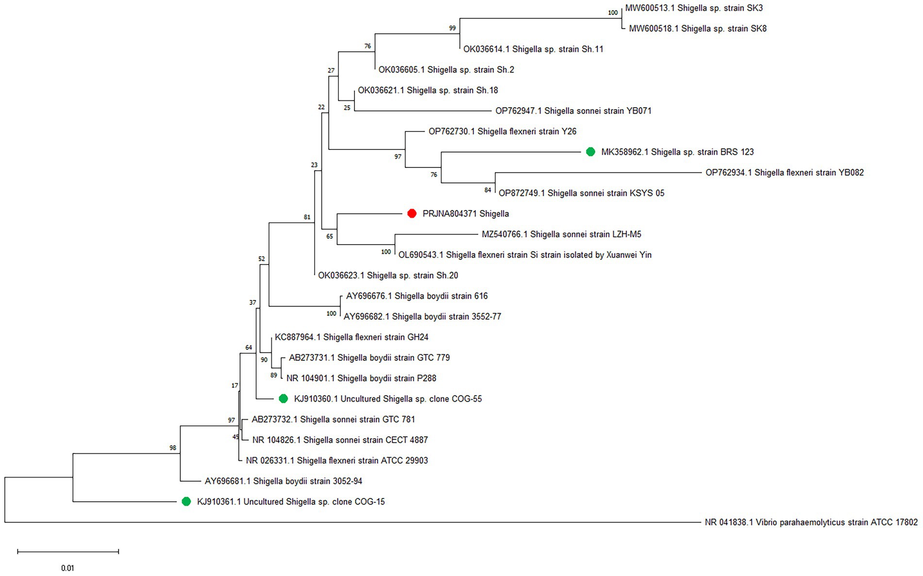 Phylogenetic tree depicting relationships among various Shigella strains with identifiers, including Shigella flexneri, Shigella sonnei, and Shigella boydii. It includes branch lengths and bootstrap values indicating the evolutionary distance and confidence. Certain nodes are marked with colored circles for emphasis. The tree uses Vibrio parahaemolyticus as an outgroup. Scale bar represents evolutionary distance.