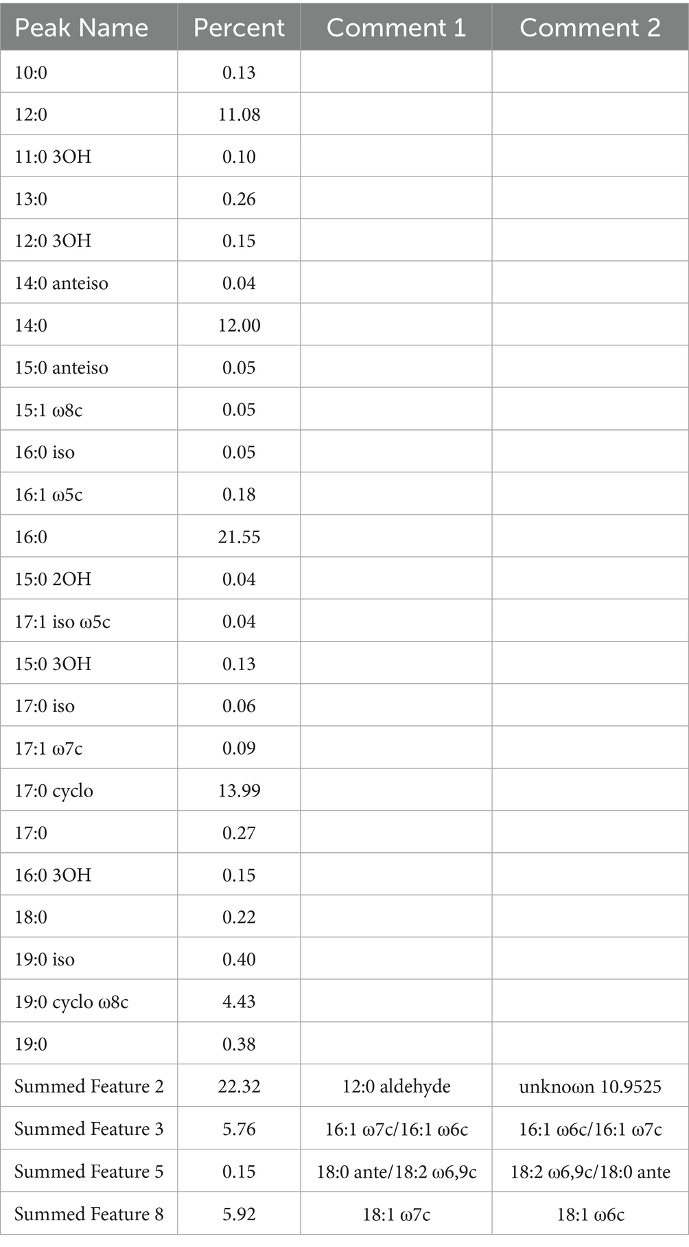 Carbon sources utilization was determined using the 96-well BIOLOG GENIII MicroPlate (OmniLog Data Collection Software, Identification System version 2.3, BIOLOG), which contained 95 different carbon substrates. Bacteria strains were cultured in TSA medium for 24 h at 30 °C, after which the cells were harvested. Cellular fatty acids were then extracted and methylated according to the standard midi protocol by Agilent 6,890 N (Fatty Acid Methyl Esters, Microbial ID, Sherlock Version 6.0B). Identification was performed by SHERLOCK® Microbial Identification System (Microbial ID, American). Short-chain fatty acids (SCFAs) were measured using GC–MS. For extraction, 1 mL of culture was mixed with 1 mL of ethyl acetate, and the upper layer was collected for GC–MS analysis. The separation of polar lipids was performed using two-dimensional thin-layer chromatography (TLC) on silica gel coated plates, 10×10 cm; Merck. The detection of total lipds was accomplished by employing a solution of 10% ethanolic molybdate and phosphoric acid (Sigma). Aminolipids were detected using a 0.4% solution of ninhydrin (Sigma) in butanol. The presence of phospholipids was detected using a Zinzadze reagent (a molybdenum blue spray reagent with a concentration of 1.3%, obtained from Sigma). The identification of glycolipids was accomplished through the utilization of a 0.5% α-naphthol sulphuric acid reagent.