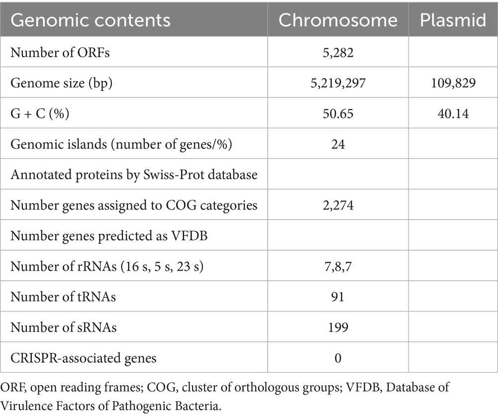 Genome assembly resulted in two gap-free, circular contigs. The larger contig, with a total length of 5,219,297 bp (Figure 4A; Table 3), corresponds to the chromosomal replicon. The smaller contig measured 109,829 bp and likely represents the virulence plasmid (Figure 4B).