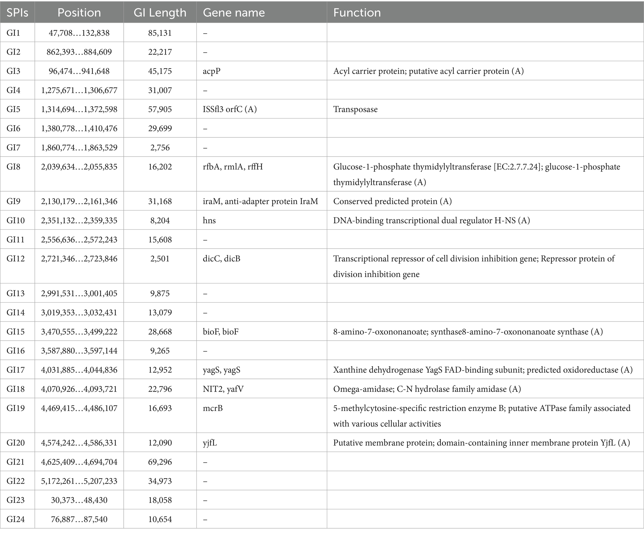 To further elucidate the genomic basis of adaptation and virulence, mobile genetic elements in JZ001 were analyzed. The chromosome of JZ001 was predicted to contain 24 genomic islands (GIs), designated GI1–GI24 (Table 4). Several of these GIs were associated with virulence and included SPI-1, SPI-3, SPI-5, SPI-8, SPI-11, SPI-15, SPI-18, and SPI-21. Their structures and functions are illustrated in Figure 5. GI 21 of this strain harbors the cidA and tib genes, whereas GI 18 contains four core genes: rfbA, rfbC, gndA, and ugd. GI 5 carries cidA, hrpB, tibA, and cah. GI 3 is enriched in multiple genes related to virulence and metabolism, including cidA, cyaB, and pic. Here, cyaB acts as a core effector gene contributing to pathogenicity, while picA and picB encode serine proteases. GI 1 predominantly carries the cidA and ehaG genes.