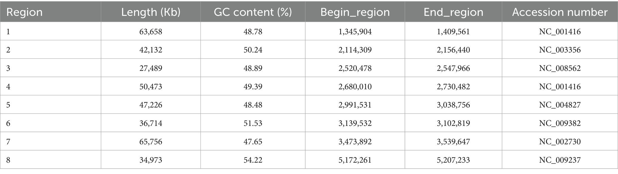 Prophages temperate phage genomes integrated into the bacterial chromosome are known to enhance bacterial adaptability and adhesion. PHAST analysis identified eight prophage regions in JZ001, totaling 368,421 bp, with an average length of 46,052.62 bp. Details of these prophages, including length, genomic position, number of CDSs, and GC content, are presented in Table 5.