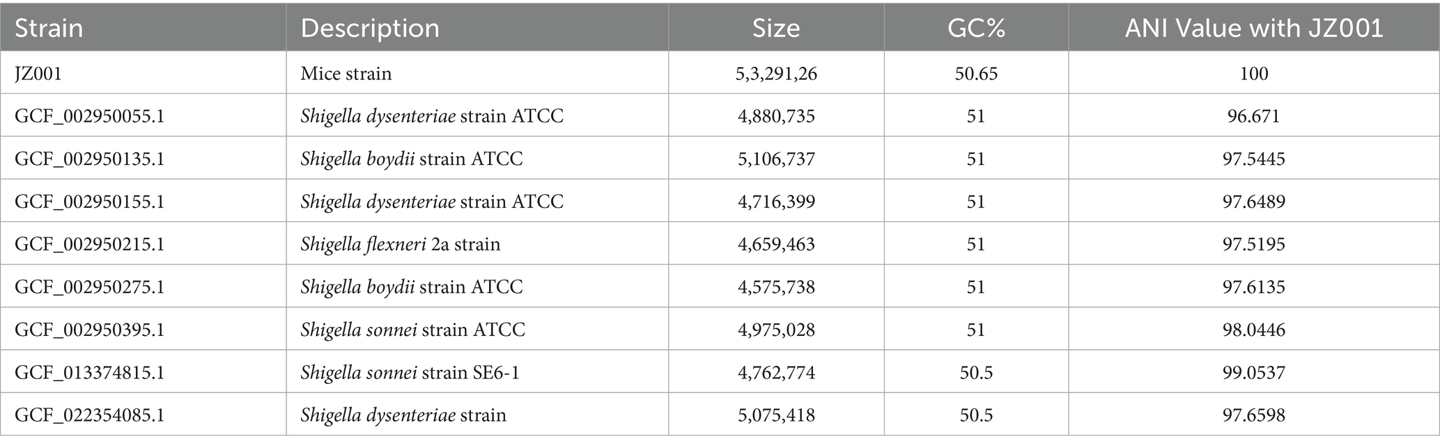 Comparative genomic analysis revealed that JZ001 shares >99% average nucleotide identity (ANI) with Shigella sonnei strain SE6-1 (MZ540766.1), strongly supporting its tentative classification as S. sonnei. ANI is widely used to assess evolutionary relationships and species boundaries, with values >95% indicating that two genomes belong to the same species (50, 51). JZ001 and S. sonnei clearly exceed this threshold, providing robust genomic evidence to classify JZ001 as a member of S. sonnei. A notable limitation, however, is the difference in host origin: JZ001 was isolated from mice, whereas all reference genomes (including SE6-1) are human-derived. Because Shigella is traditionally regarded as a human-specific pathogen, and there are currently no literature reports on naturally occurring Shigella isolates from mice, it remains unclear whether JZ001 represents a mouse-adapted variant of S. sonnei. Future studies should compare the transcriptomic profiles of JZ001 during murine infection with those of human-derived S. sonnei strains to identify host-specific gene expression signatures.