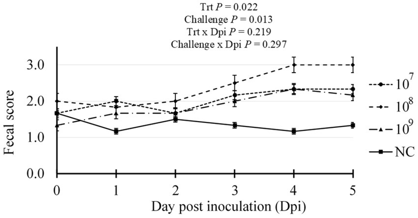 Daily feed consumption was measured for the duration of the experiment by weighing feeders and calculating feed disappearance. Fecal scores were recorded daily by one individual during both the acclimation and challenge periods using a scale of 0 = solid, 1 = semi-solid, 2 = soft, 3 = liquid. Body weights were recorded at placement (−10 dpi), 0 dpi, and 5 dpi to calculate average daily gain (ADG), average daily feed intake (ADFI), and gain:feed.