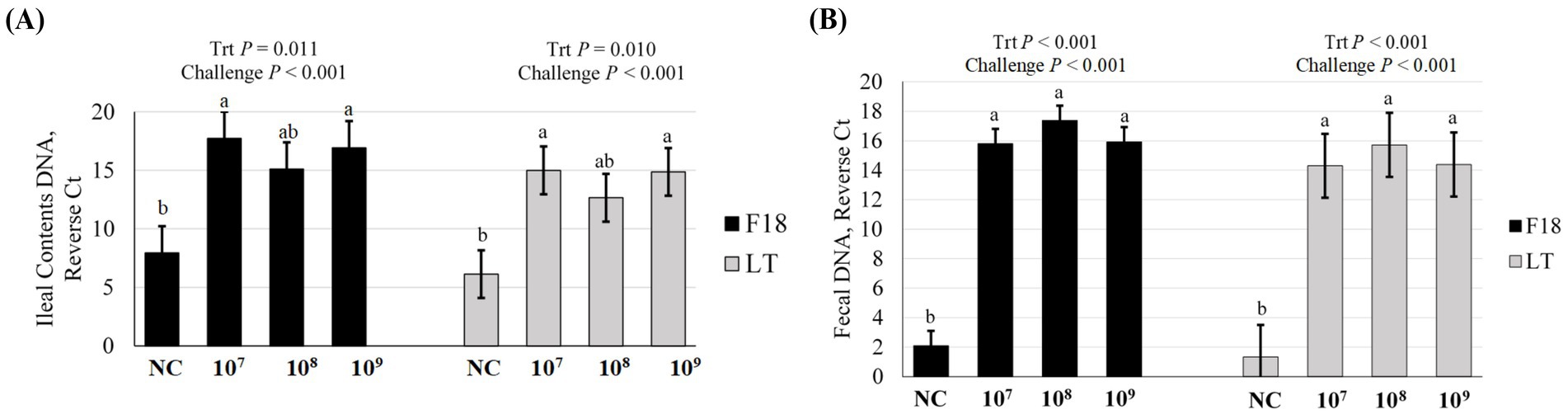 Fresh fecal and ileal contents were collected from all pigs at 0 and 5 dpi. These samples were immediately placed on ice and then stored at −80 °C until DNA extraction. Total DNA was isolated from 0.25 g of the sample using a QIAamp® PowerFecal® Pro DNA Kit (QIAGEN, Germantown, MD, USA) following the manufacturer’s instructions. DNA concentrations and purity were verified using a spectrophotometer (Cytation 5 Hybrid Multi-Mode Reader, BioTek Instruments, Inc., Winooski, VT). All samples had a 260/280 ratio of 1.8–2.0. Fecal and ileal DNA samples were used for quantitative PCR (qPCR) using TaqMan Fast Advanced Master Mix (ThermoFisher Scientific, Waltham, MA, USA) with 20X gene-specific primers for F18 and LT. The sequences for the F18 and LT primer sets were as follows: F18 forward primer (5′-3′): GCGTCGAATAGCACTGTAAGTTTC, F18 reverse primer: ACCACCTTTCAGTTGAGCAGTAAAT, LT forward primer (5′-3′): GCAGGCAAAAGAGAAATGGTTATCA, and LT reverse primer: CCGGGACTTCGACCTGAA (ThermoFisher Scientific, Waltham, MA, USA). Each 20 μl sample reaction contained 10 μl of TaqMan Fast Advanced Master Mix, 1 μl of F18 primer, 1 μl of LT primer, 1 μl of template DNA (50 ng/μl), and 7 μl of nuclease-free water. Fluorescence was quantified using a QuantStudio™ 3 Real-Time PCR System (ThermoFisher Scientific, Waltham, MA, USA) with the following conditions: 20-s hold for polymerase activation at 95 °C followed by 40 RT-PCR cycles (denature at 95 °C for 1 s, anneal/extend at 60 °C for 20 s). QuantStudio™ Design & Analysis Software (ThermoFisher Scientific, Waltham, MA, USA) was used to analyze amplification plot, and cycle threshold (Ct) values for each reaction were determined. A reverse Ct value was then calculated as the difference between the Ct value of the gene of interest and the maximum Ct of 40 amplification cycles for the assay.