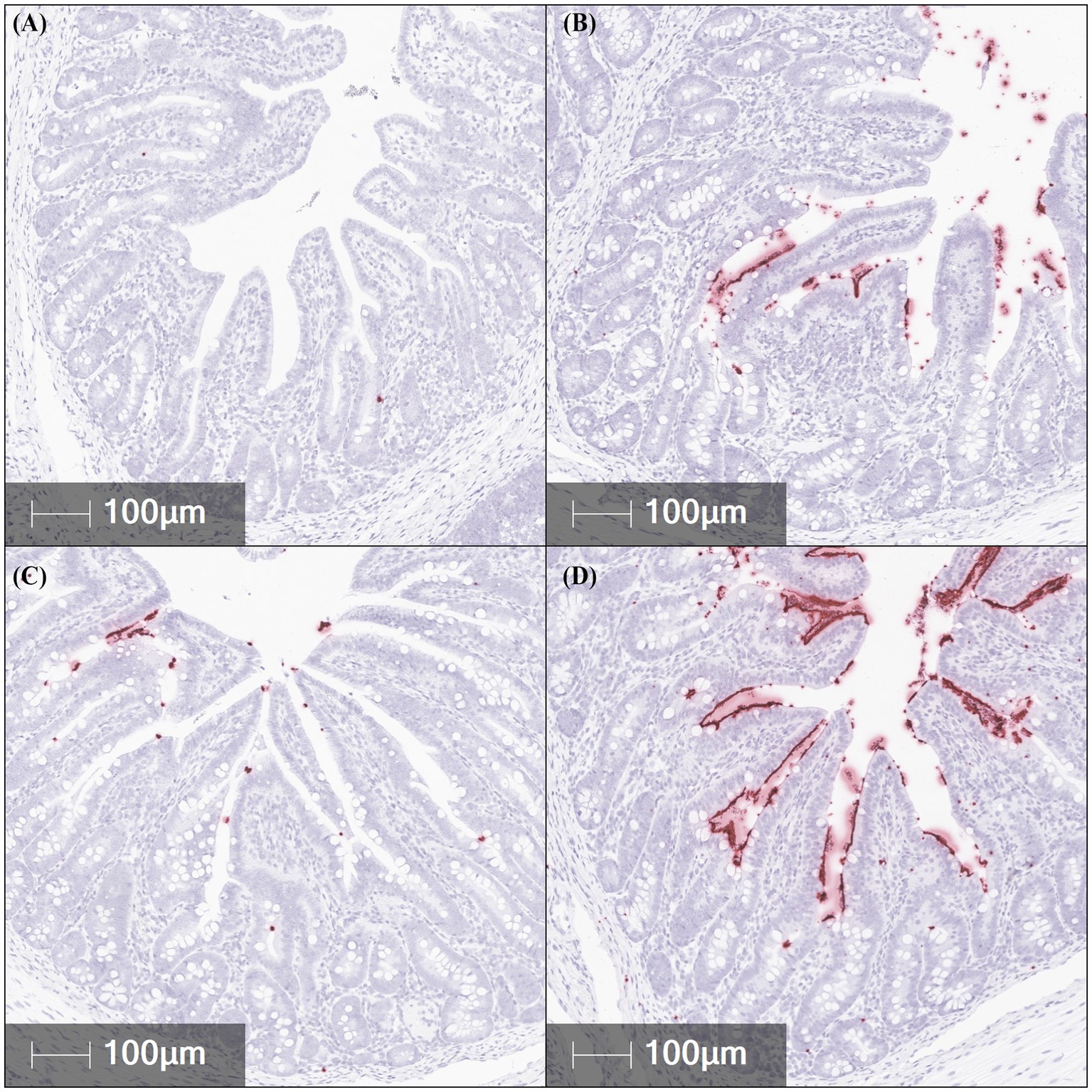 Figure 3. Representative in situ hybridization images of F18 transcript abundance (red staining) in fixed ileal tissues from pigs challenged with F18 enterotoxigenic Escherichia coli at 5 dpi. (A–D) represent: Negative control (0 cfu, A—top left), 107 cfu (B—top right), 108 cfu (C—bottom left), and 109 cfu (D—bottom right). N = 6 pigs/treatment.