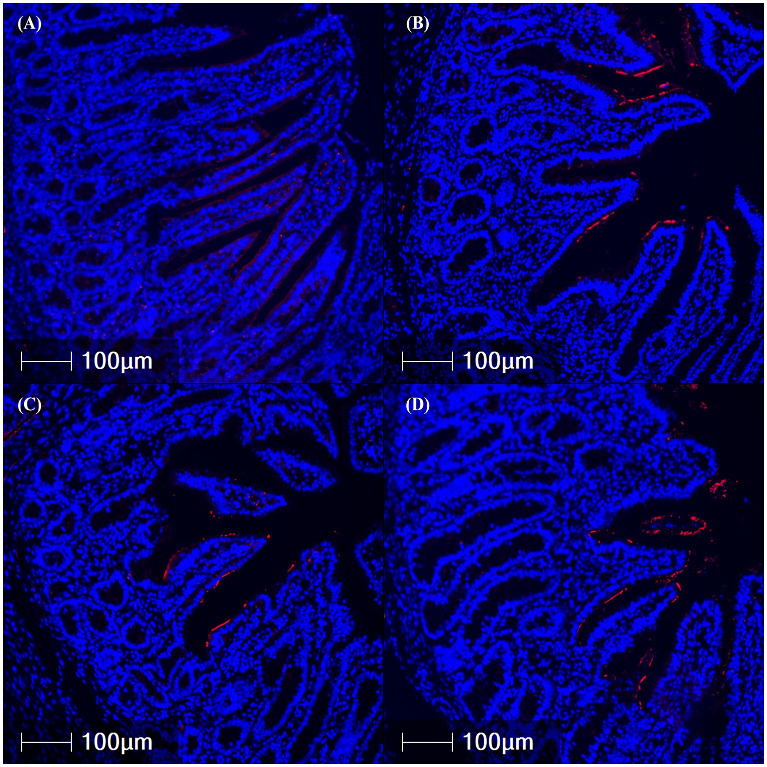 Figure 4. Representative images of ileal cystic fibrosis transmembrane conductance regulator protein abundance (red fluorescence) in fixed tissues from pigs challenged with F18 enterotoxigenic Escherichia coli at 5 dpi. (A–D) represent: Negative control (0 cfu, A—top left), 107 cfu (B—top right), 108 cfu (C—bottom left), and 109 cfu (D—bottom right). N = 6 pigs/treatment.