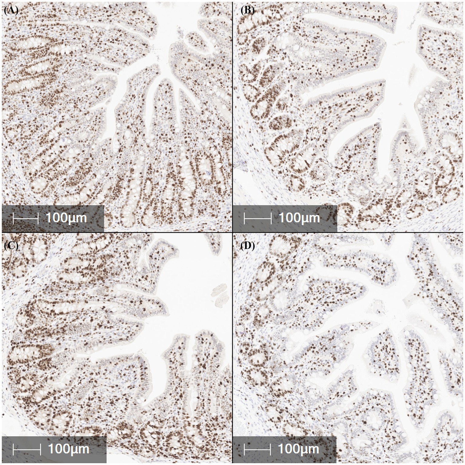 Figure 5. Representative images of Ki67 positive expression (brown staining), a marker of cell proliferation, in fixed ileal tissues from pigs challenged with F18 enterotoxigenic Escherichia coli at 5 dpi. (A–D) represent: Negative control (0 cfu, A—top left), 107 cfu (B—top right), 108 cfu (C—bottom left), and 109 cfu (D—bottom right). N = 6 pigs/treatment.