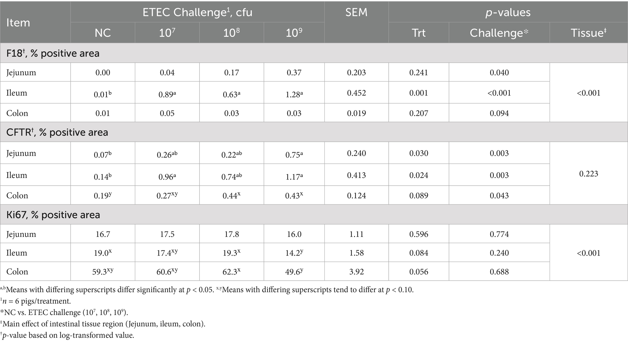 Table 1. Jejunum, ileum, and colon tissue section F18 transcript abundance, CFTR protein abundance, and Ki67 protein abundance in the pigs challenged with either 0 (NC), 107, 108, or 109 cfu of F18 enterotoxigenic Escherichia coli (ETEC) after 5 days.